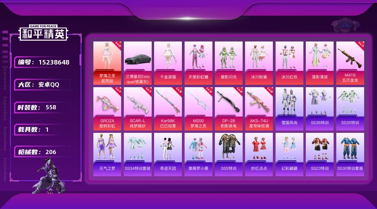实名: 可修改 时装数: 558 载具数: 1 枪械数: 206 战备数: 15