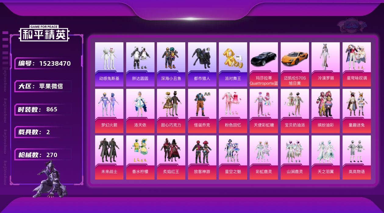 实名: 可修改 时装数: 865 载具数: 2 枪械数: 270 战备数: 21