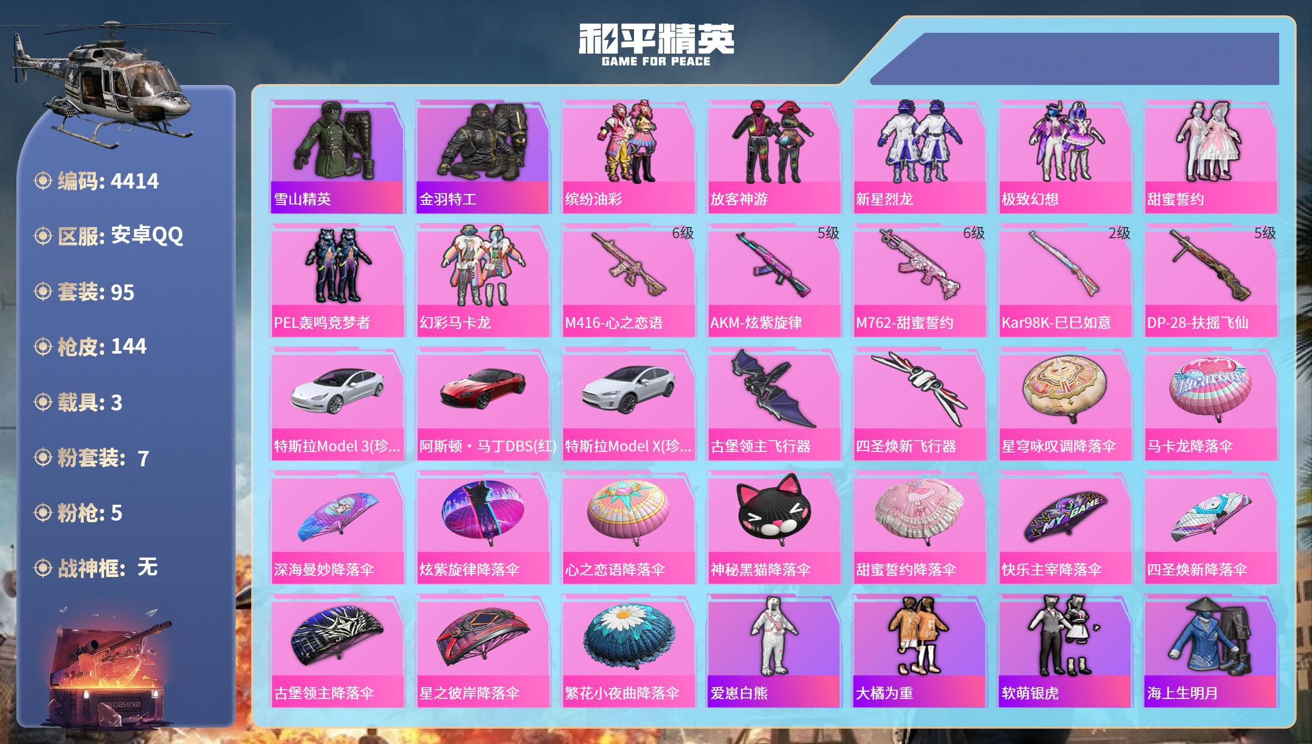 1神装-16粉装-14特效枪-0载具-11粉色飞行器-103799热力值-16王牌印记-206套装-291枪皮