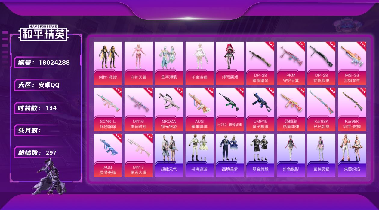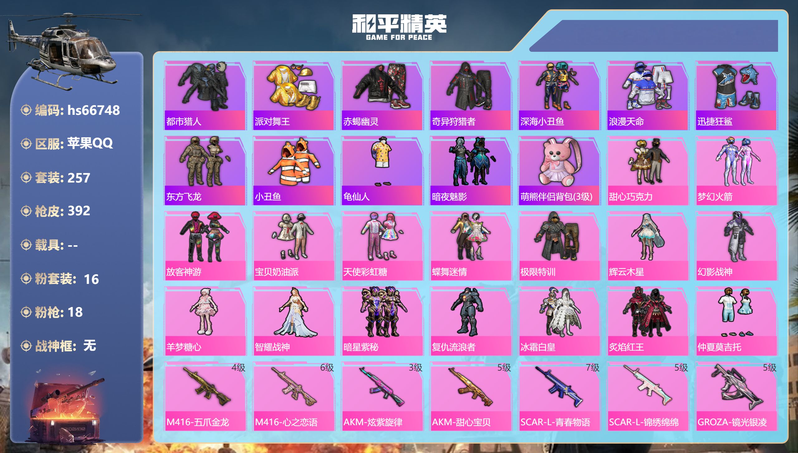 17王牌印记-16粉装-18特效枪-热力值-257套装-392枪皮-2卓越印记-2传奇印记