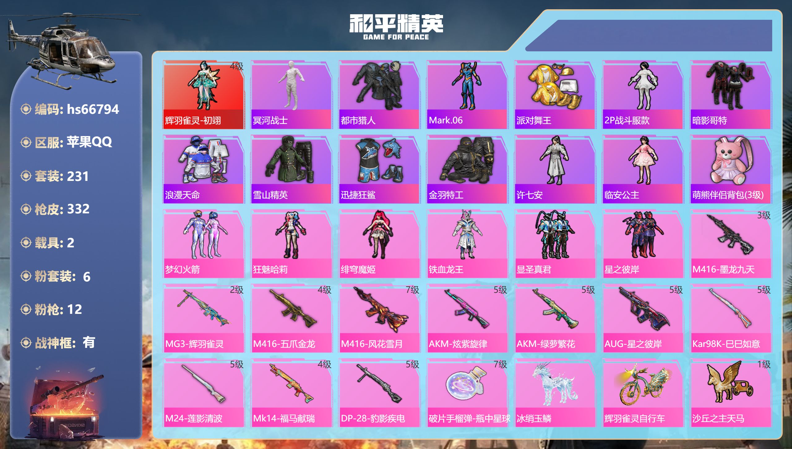 苹果手Q-17王牌印记-有战神框-1红装-6粉装-12特效枪