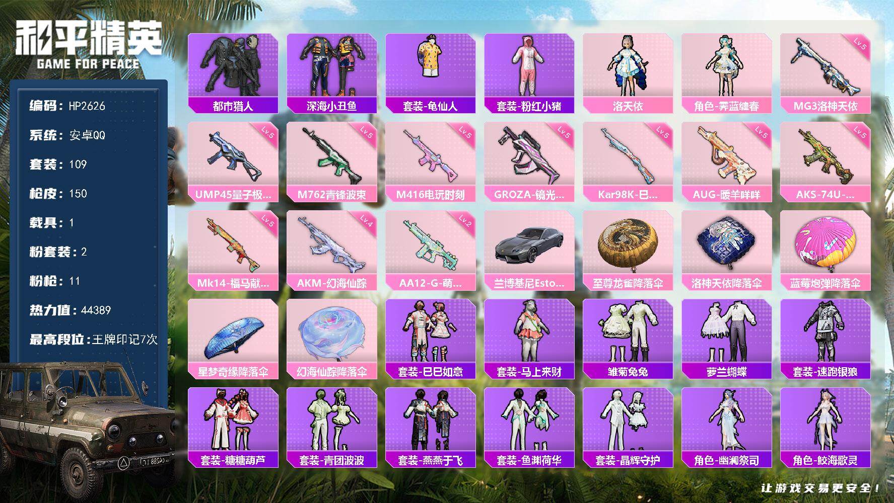 109套装/枪械11/装备157/载具1/战备94/王牌印记7/热力值44389/