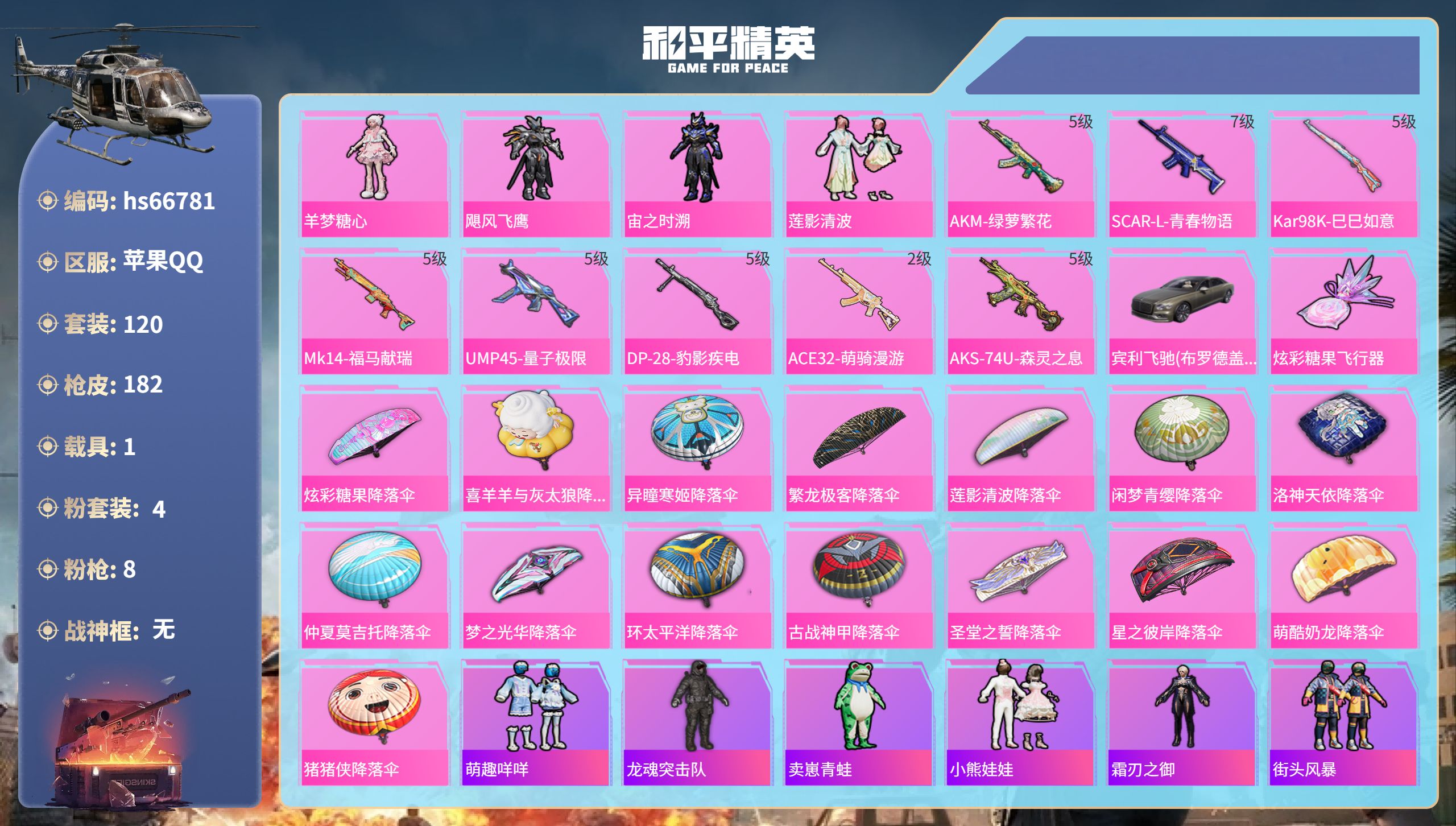 苹果 手Q-8粉装-14特效枪-4载具-8粉色飞行器-113219热力值-18王