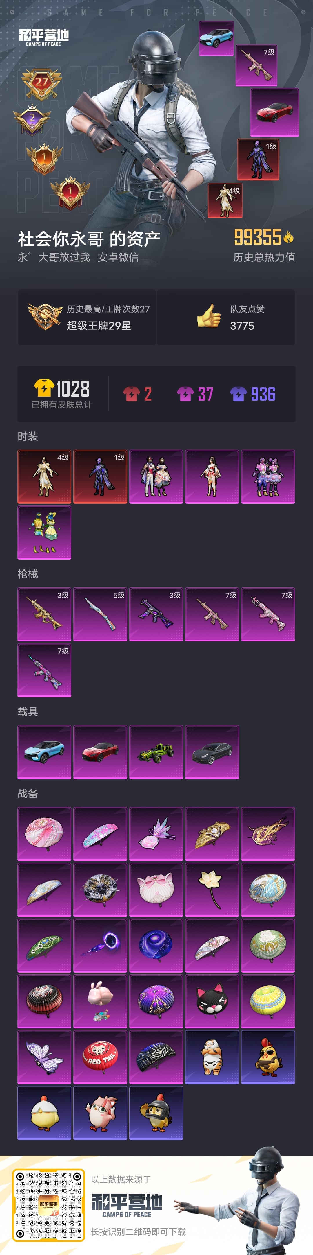 安卓 手Q-9粉装-3特效枪-0载具-3粉色飞行器-42680热力值-8王牌印