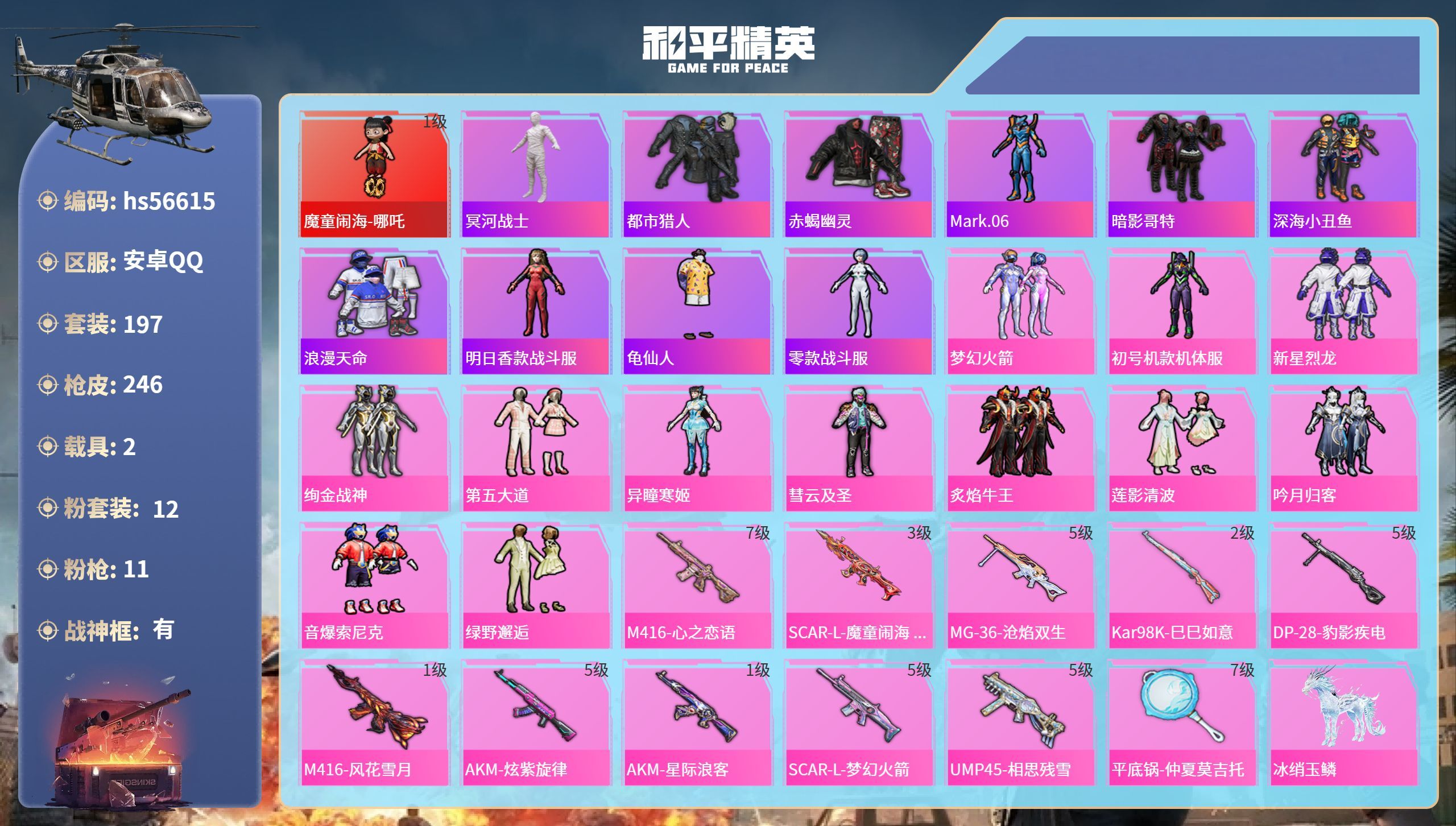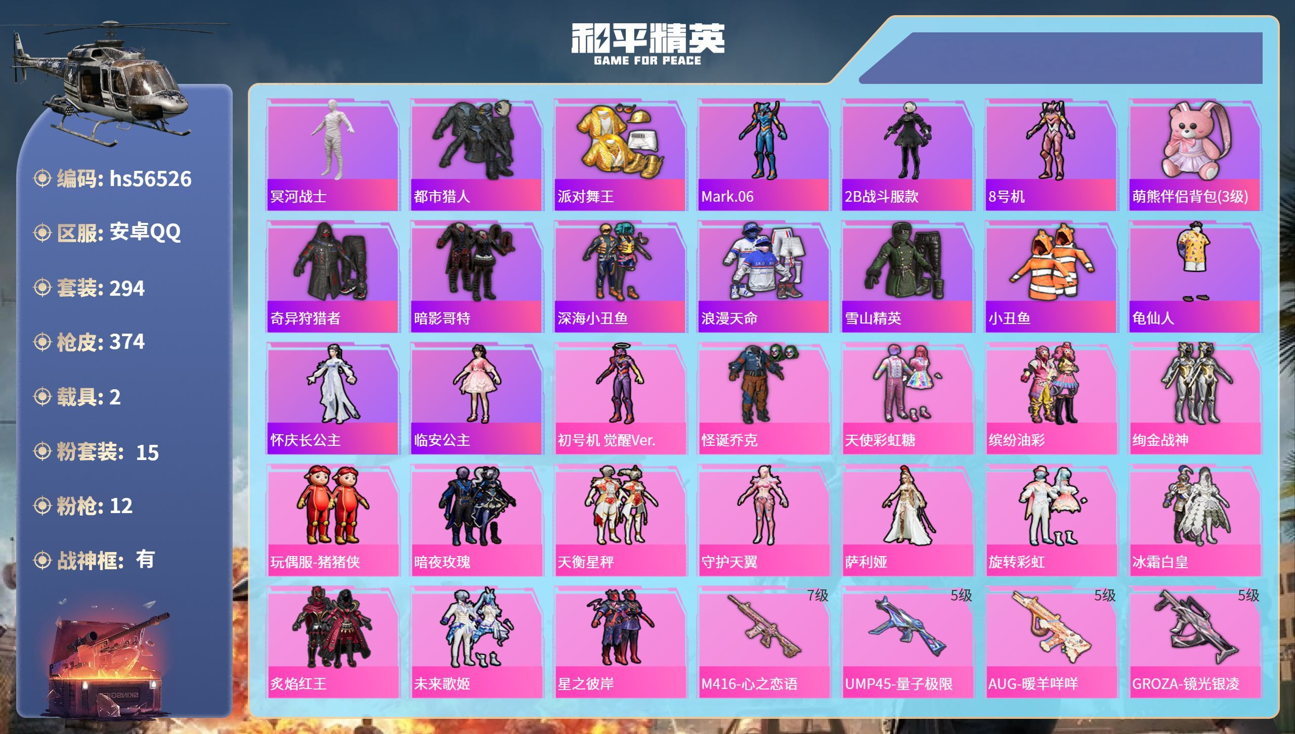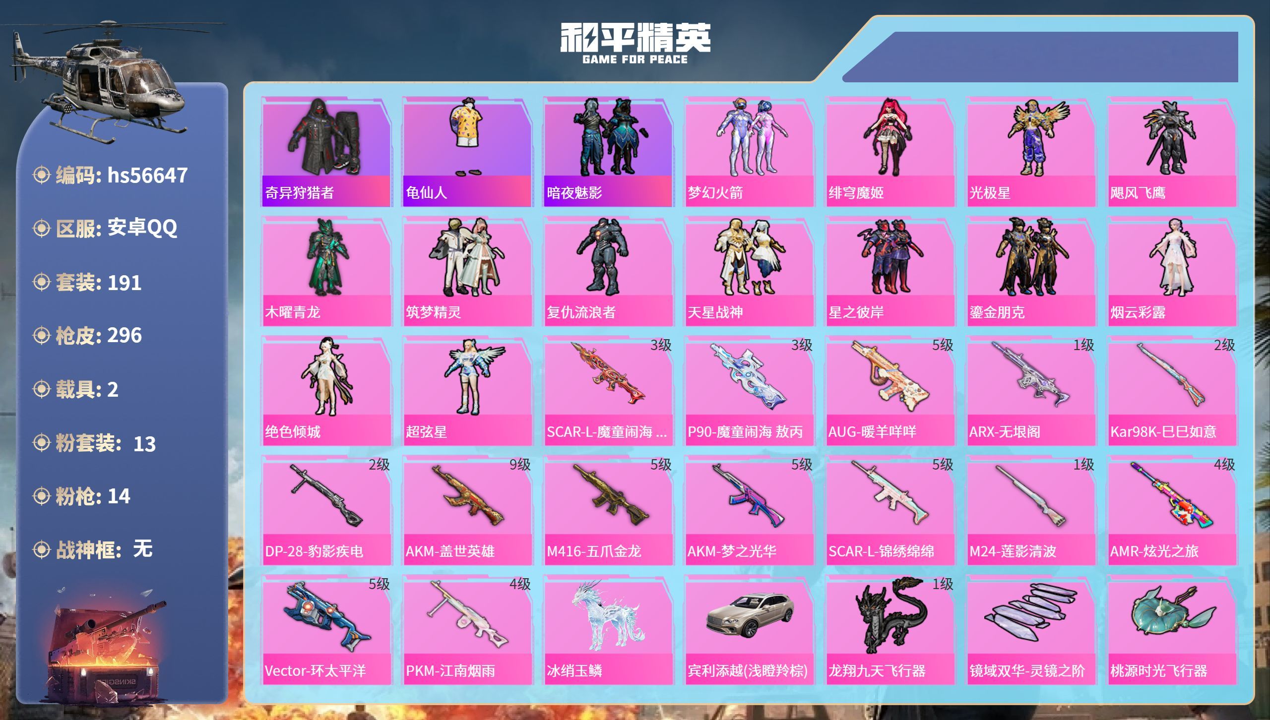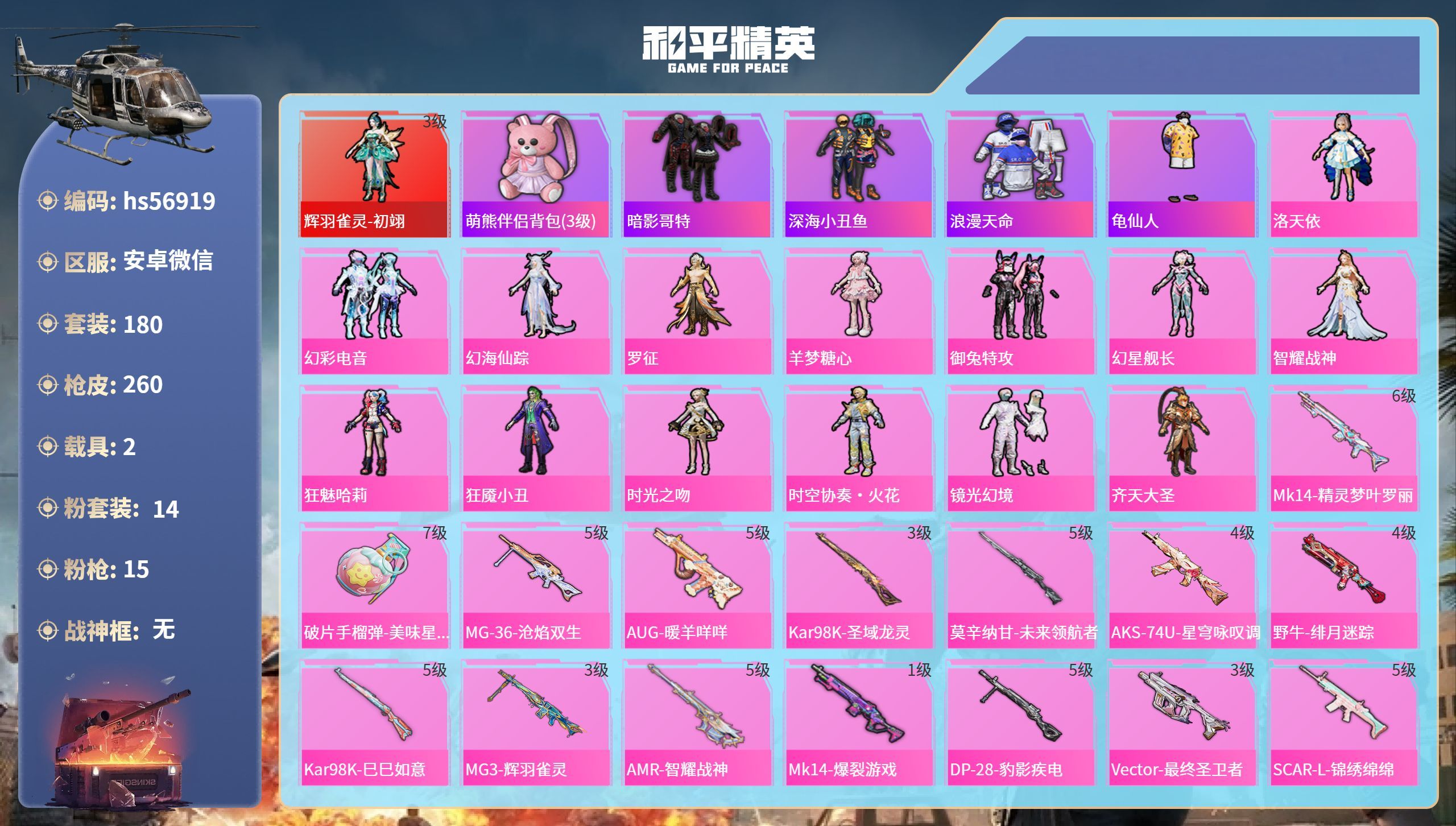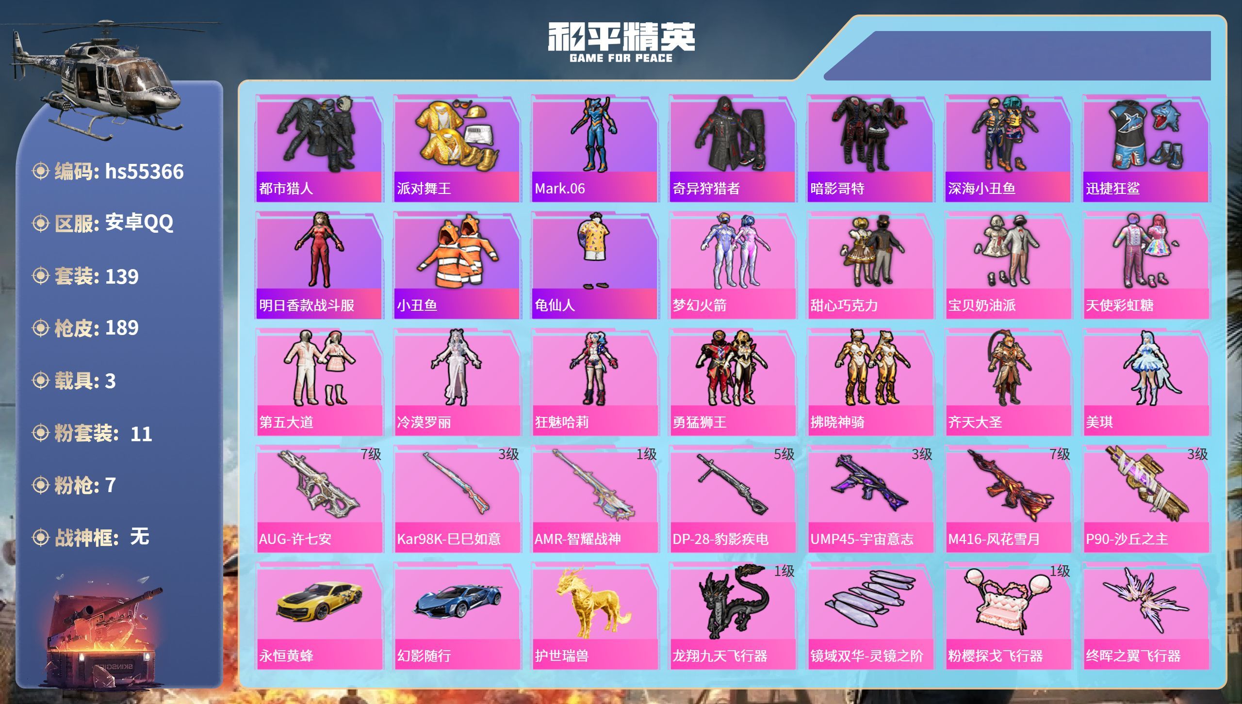 hs55366 安卓手Q-12王牌印记-11粉装-7特效枪-3载具-64908热力值-139套装-1
