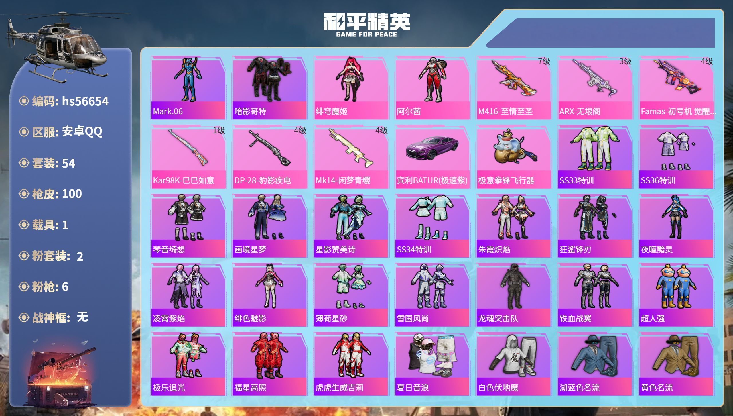 hs56654 安卓手Q-1王牌印记-2粉装-6特效枪-1载具-29064热力值-54套装-100枪
