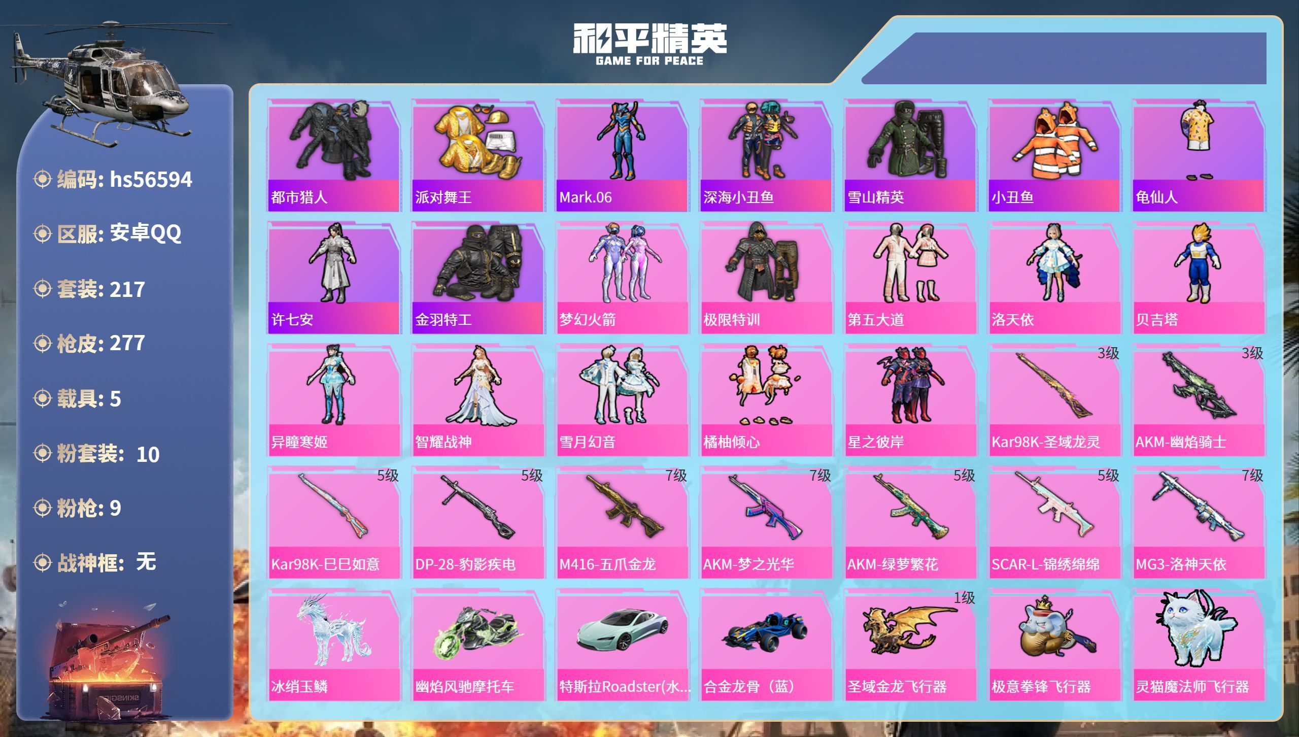 hs56594 安卓手Q-17王牌印记-10粉装-9特效枪-5载具-96517热力值-217套装-2