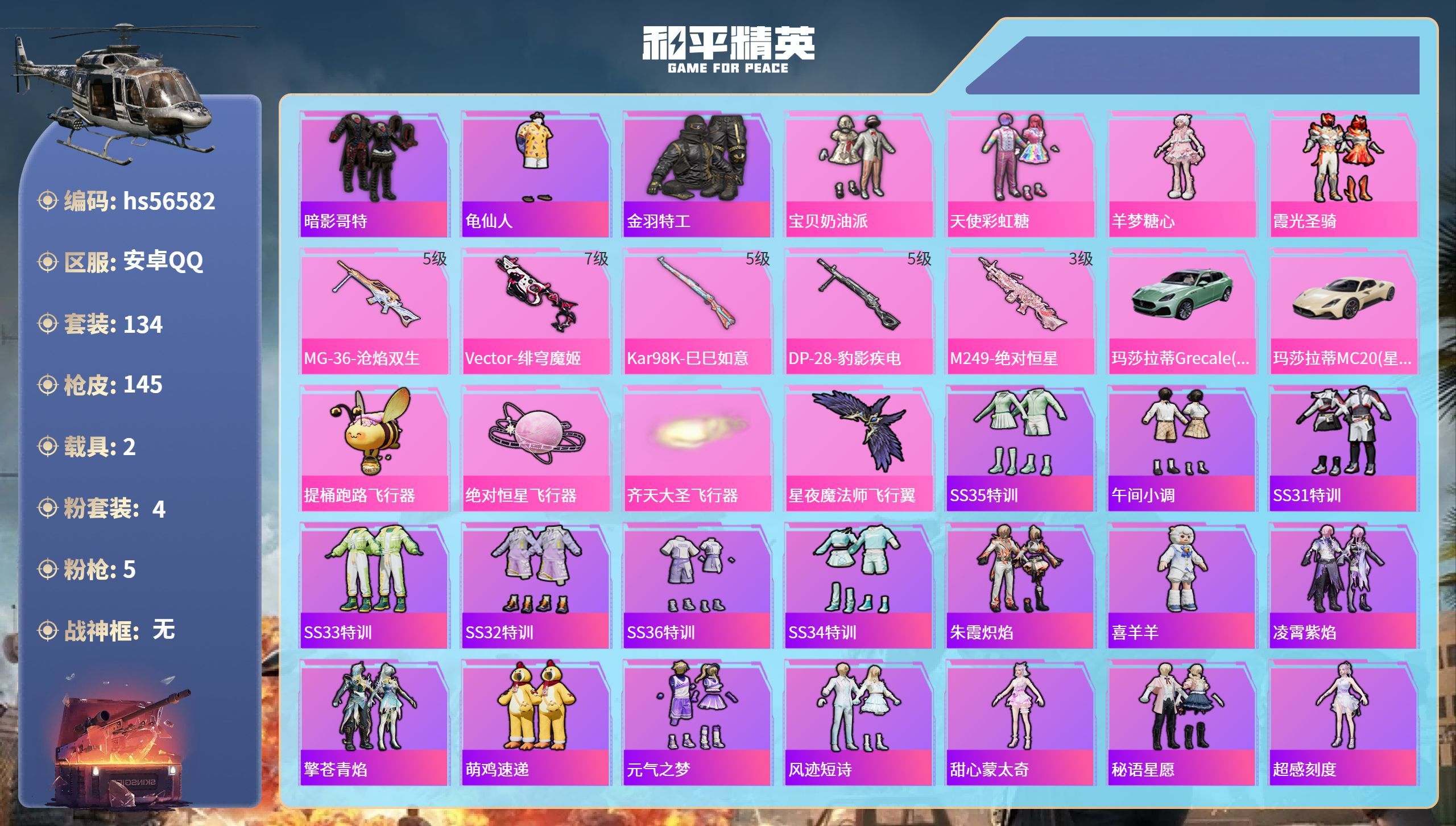 hs56582 安卓手Q-4王牌印记-4粉装-5特效枪-2载具-50040热力值-134套装-145