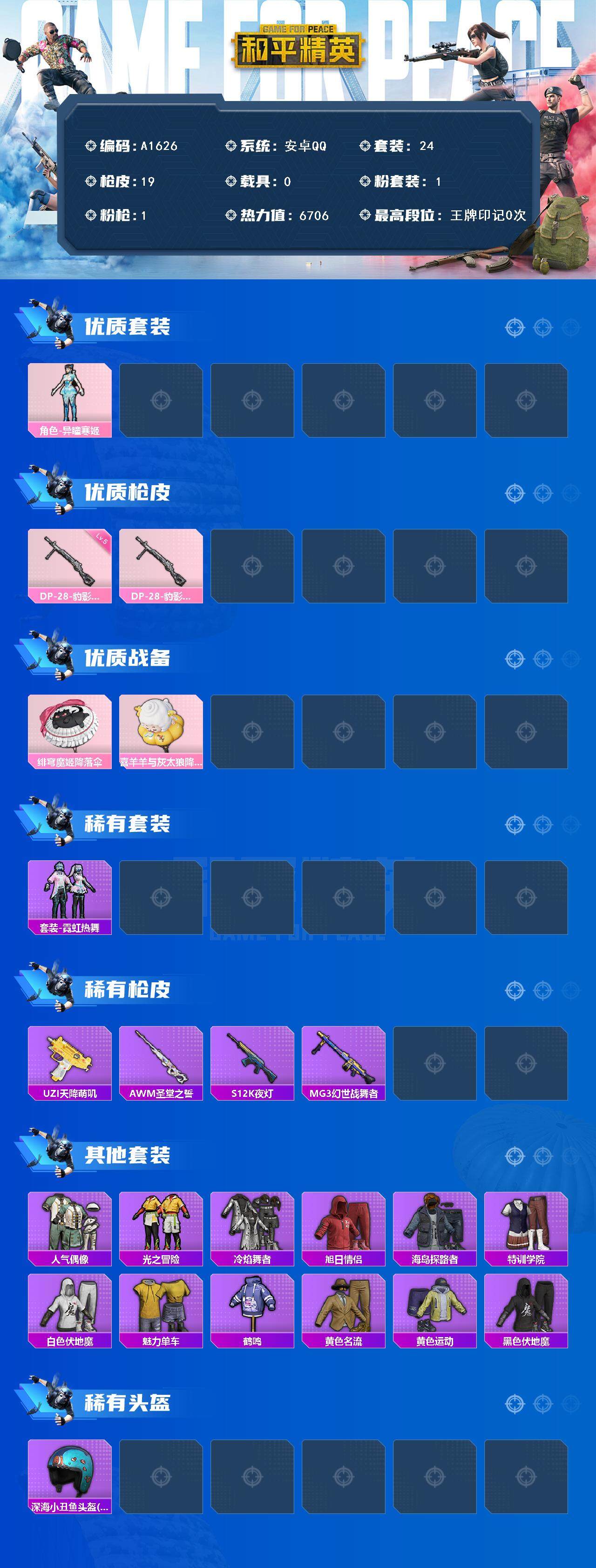 hs56652 安卓手Q-1王牌印记-1粉装-2特效枪-1载具-34537热力值-108套装-103