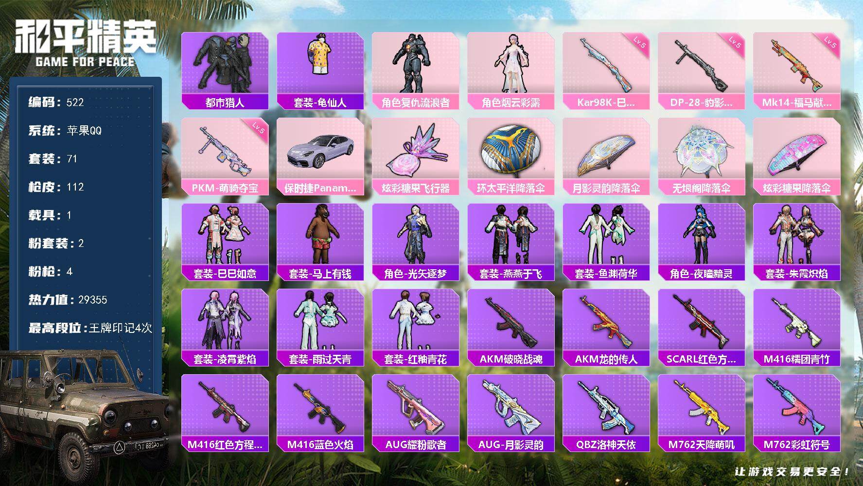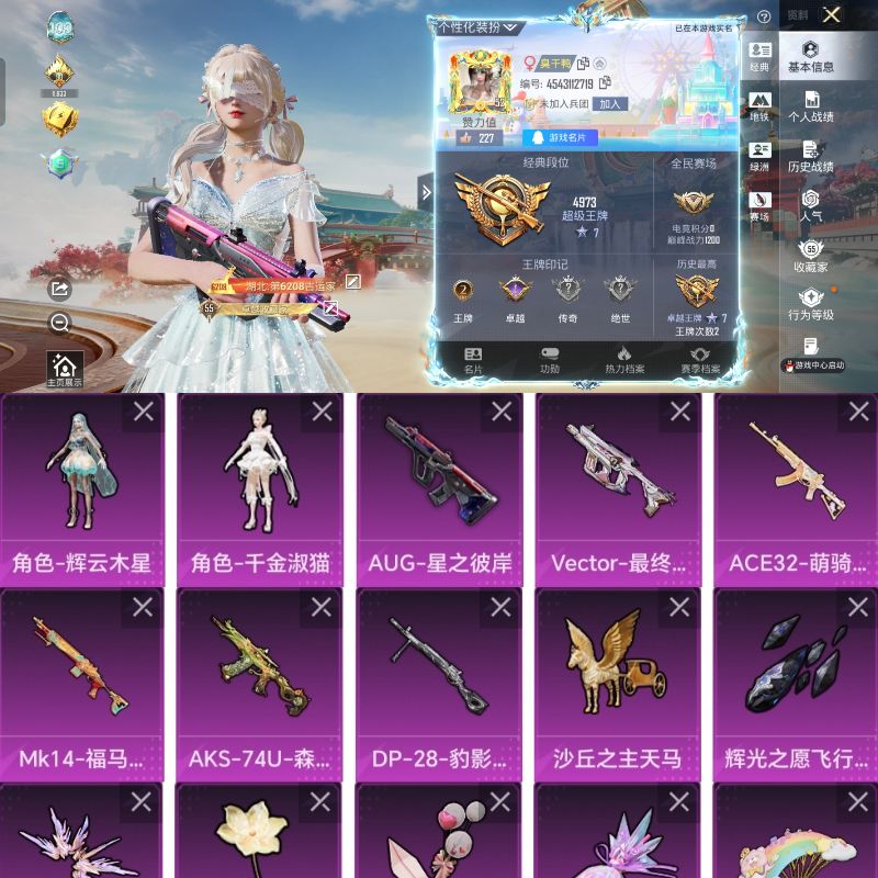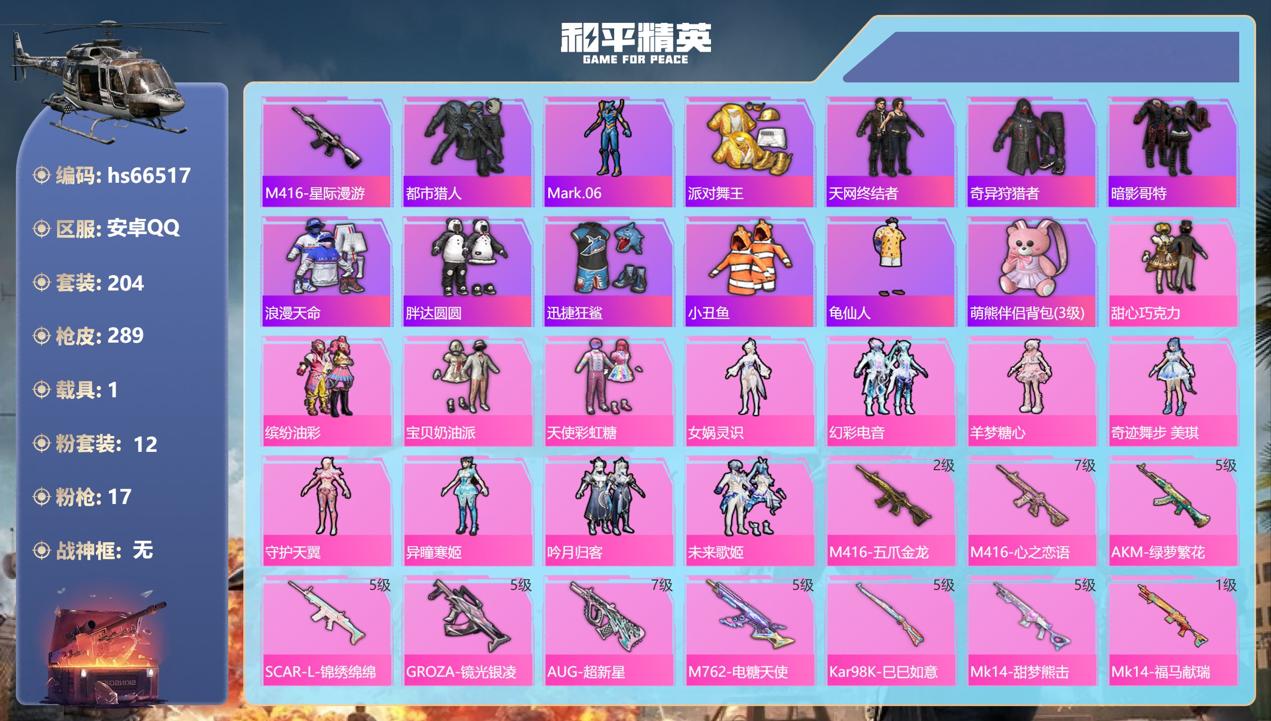 11王牌印记-12粉装-17特效枪-1载具-93391热力值-204套装-289枪皮-2卓越印记-1传奇印记