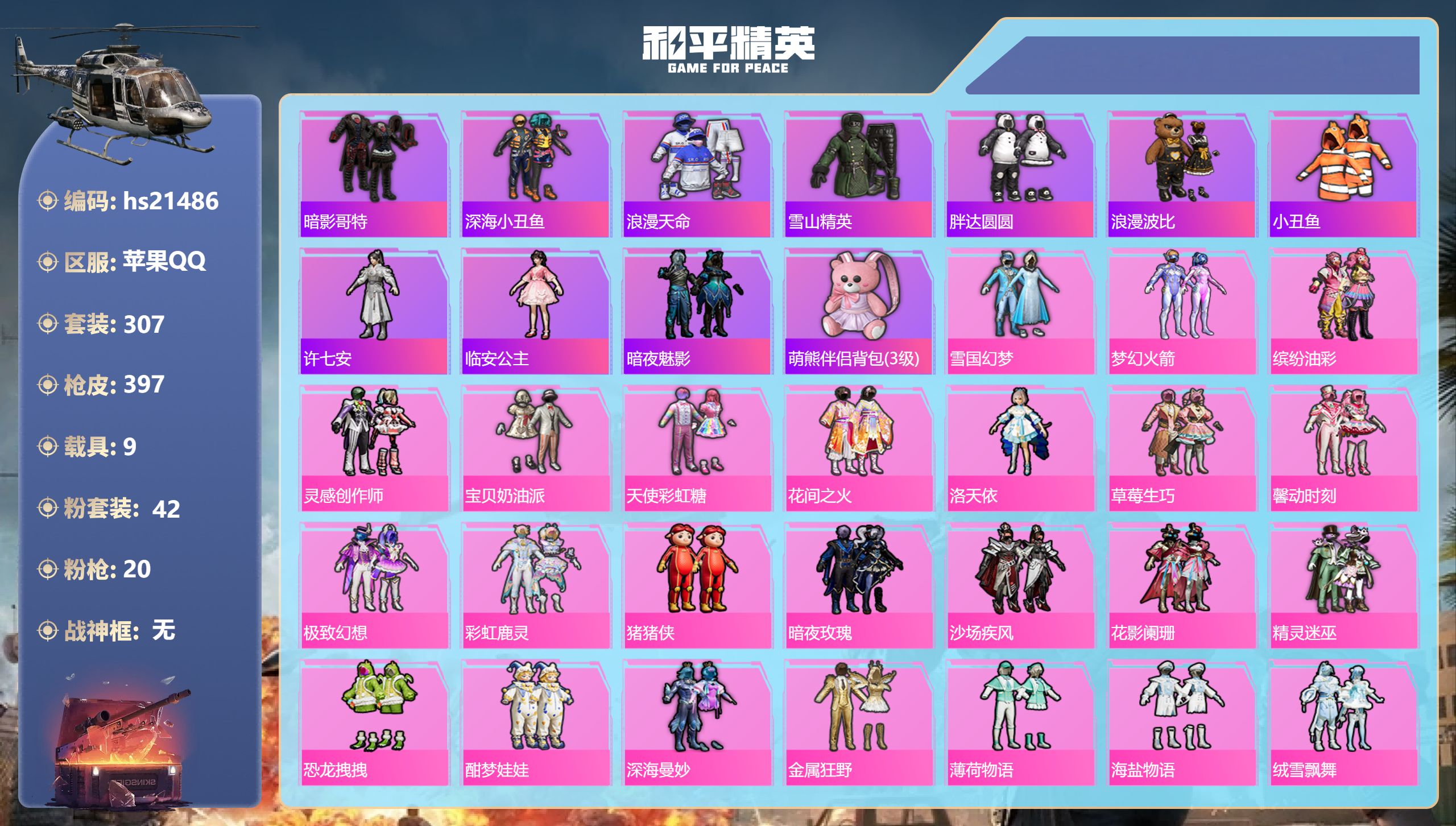 22王牌印记-42粉装-20特效枪-9载具-热力值-307套装-397枪皮