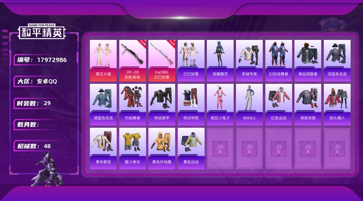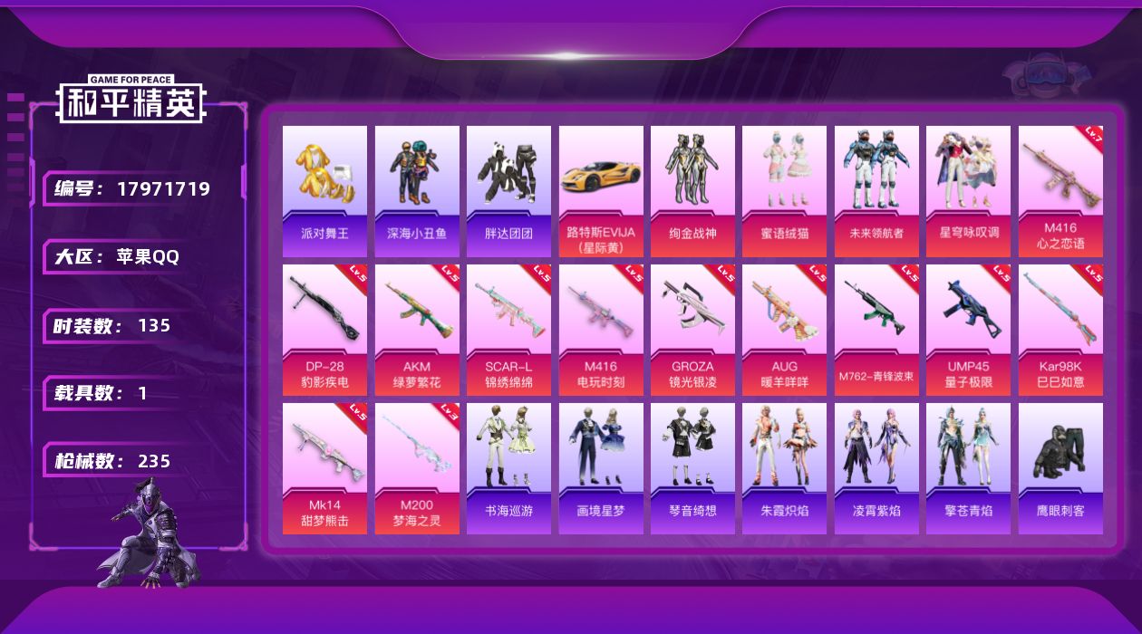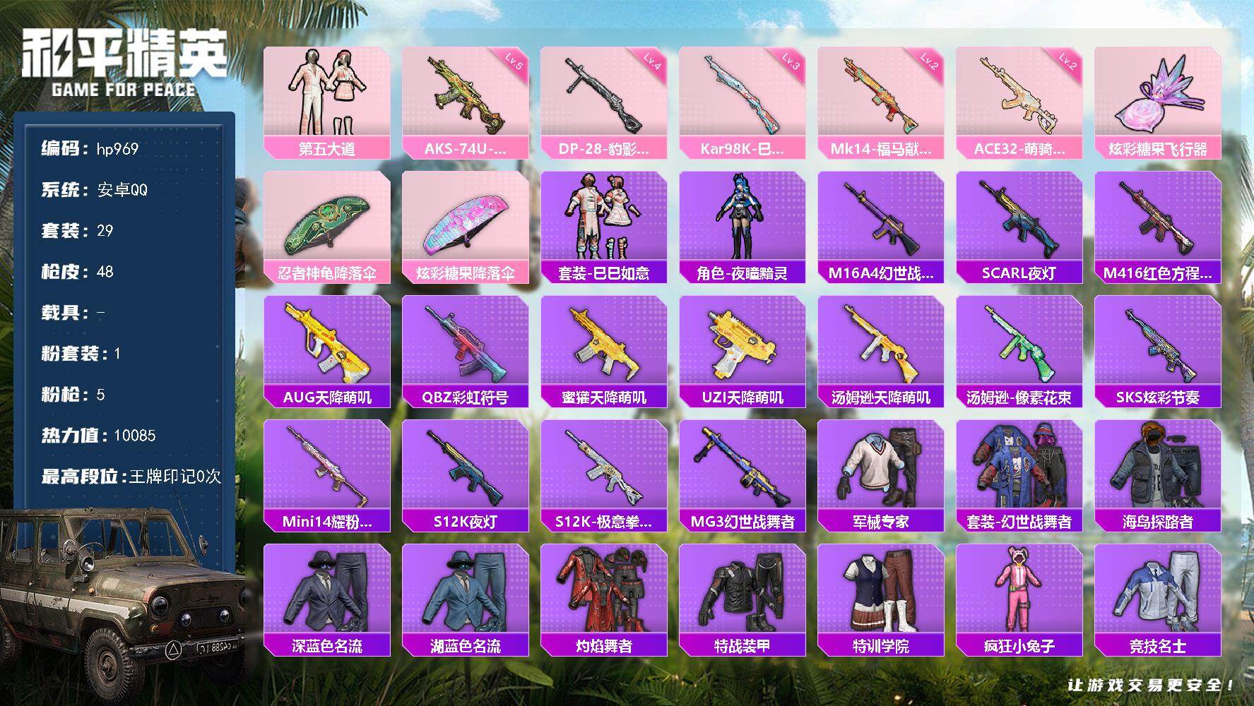 1粉装-5特效枪-0载具-1粉色飞行器-10085热力值-0王牌印记-29套装-48枪皮