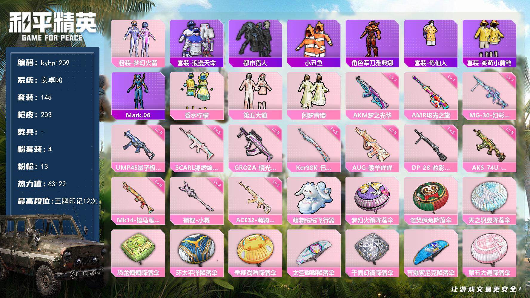 安卓 手Q-4粉装-13特效枪-0载具-1粉色飞行器-63122热力值-12王