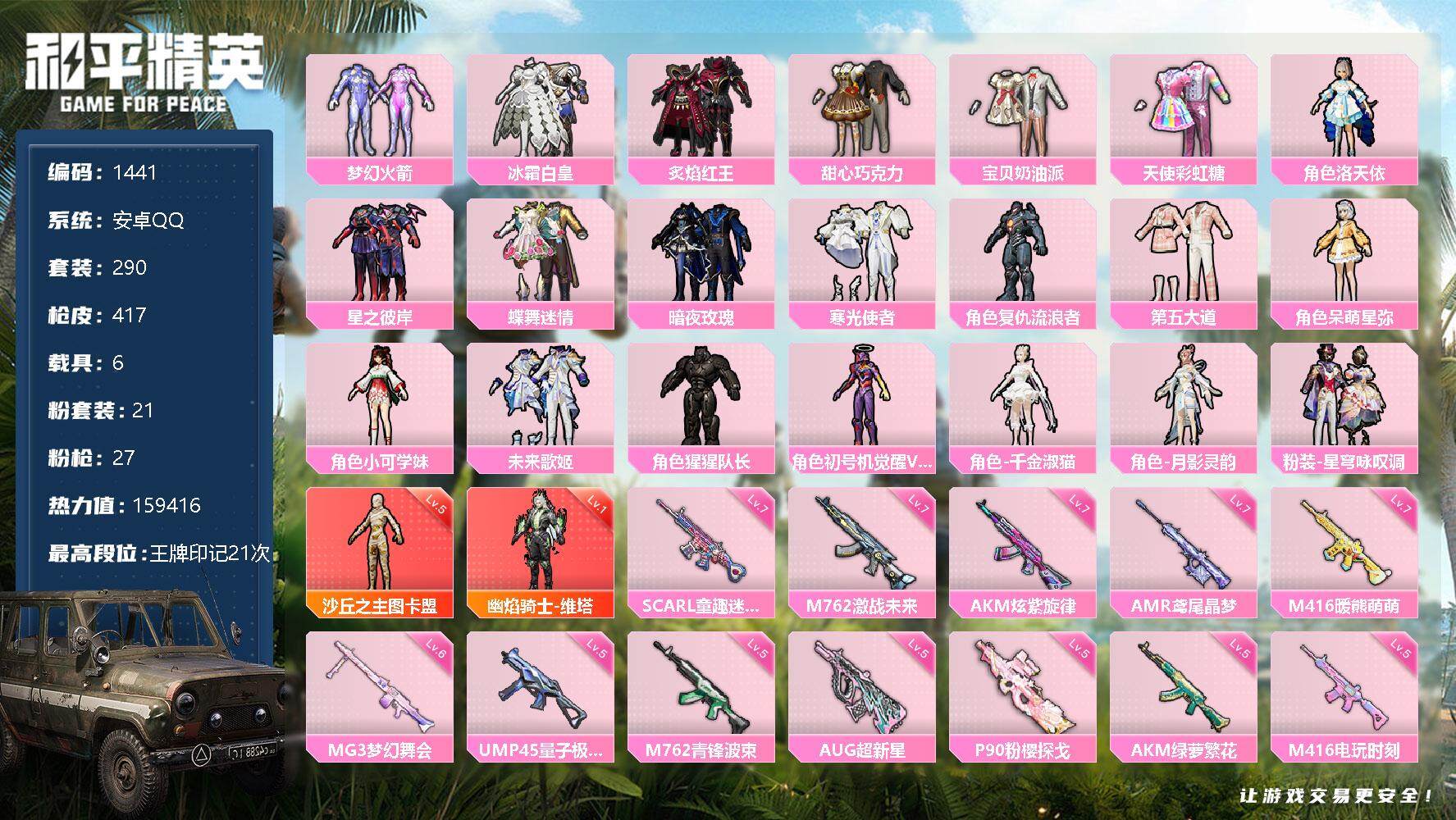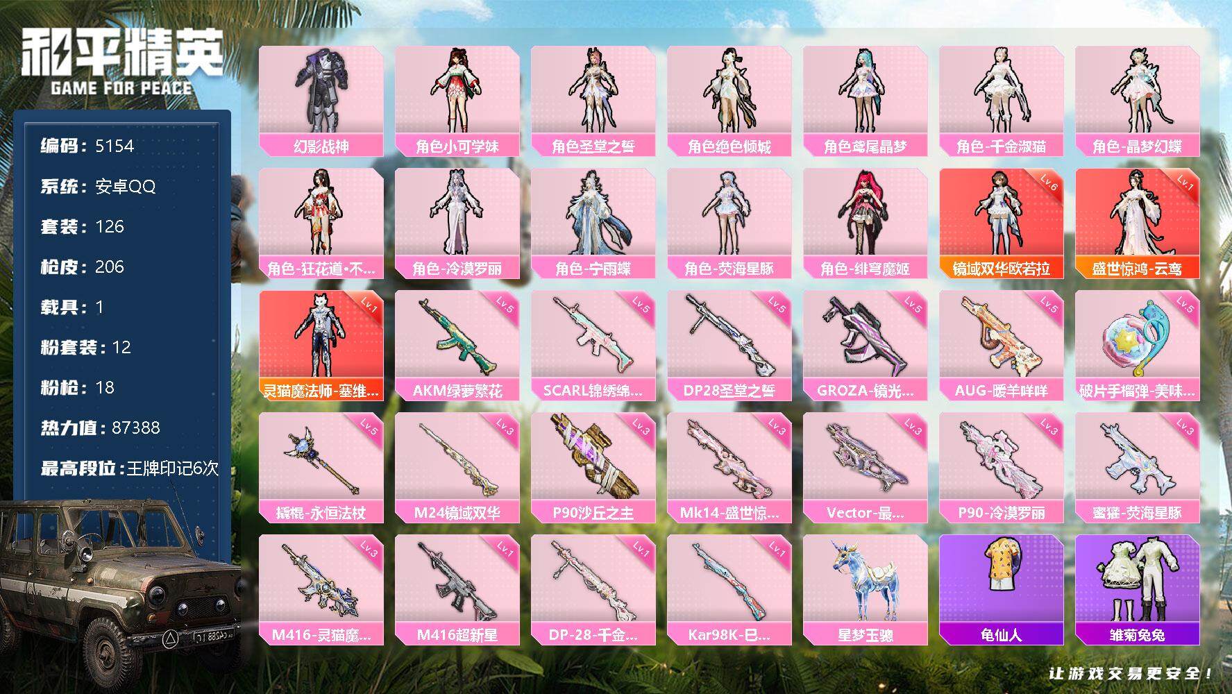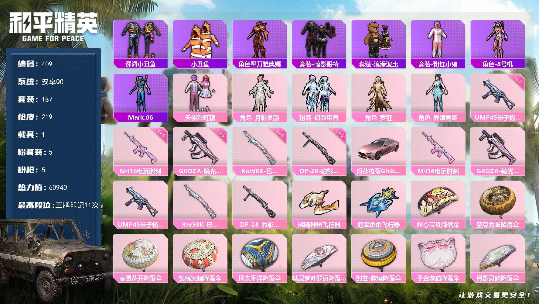 安卓 手Q-5粉装-5特效枪-1载具-3粉色飞行器-60940热力值-11王牌