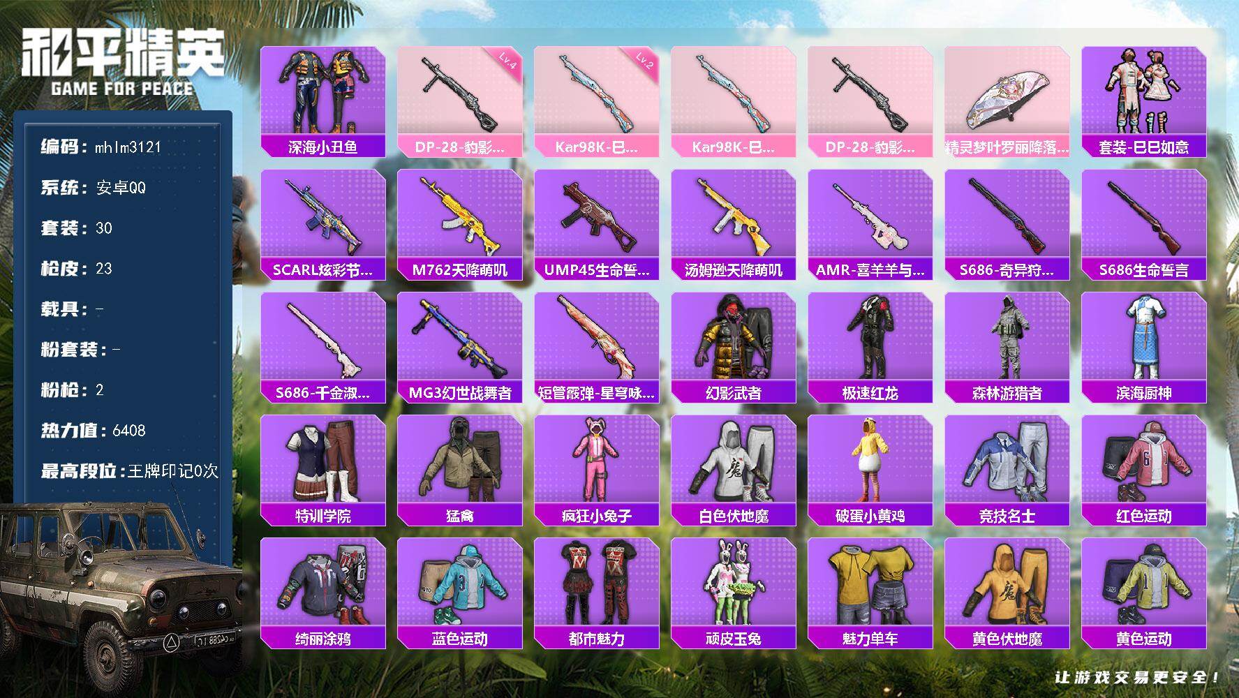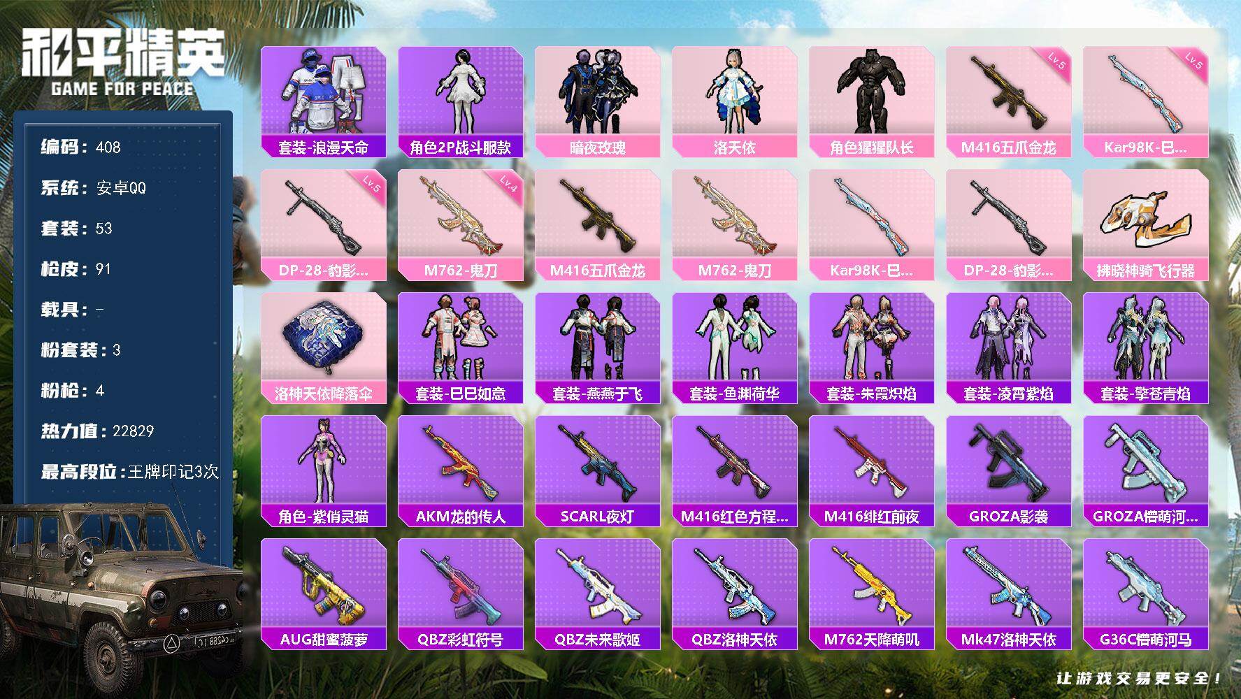安卓 手Q-3粉装-4特效枪-0载具-2粉色飞行器-22829热力值-3王牌印