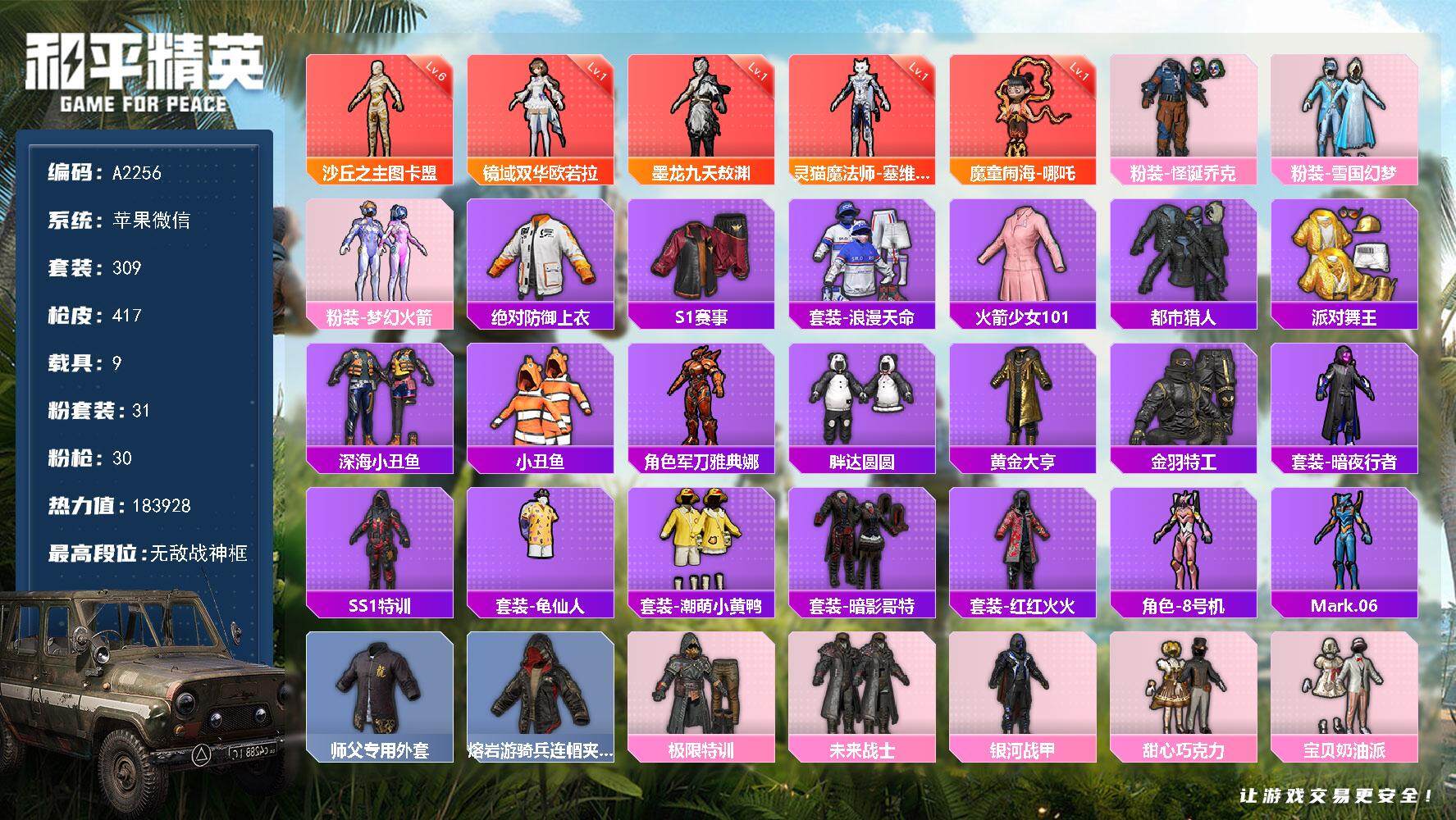 苹果 微信-无敌战神框-5神装-31粉装-30特效枪-9载具-15粉色飞行器-183928热力值