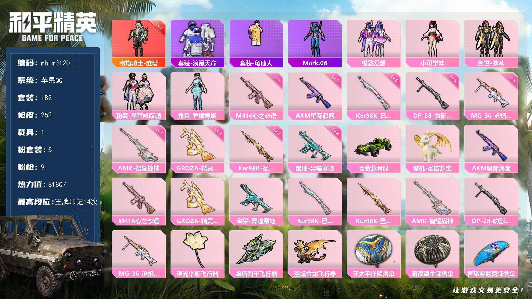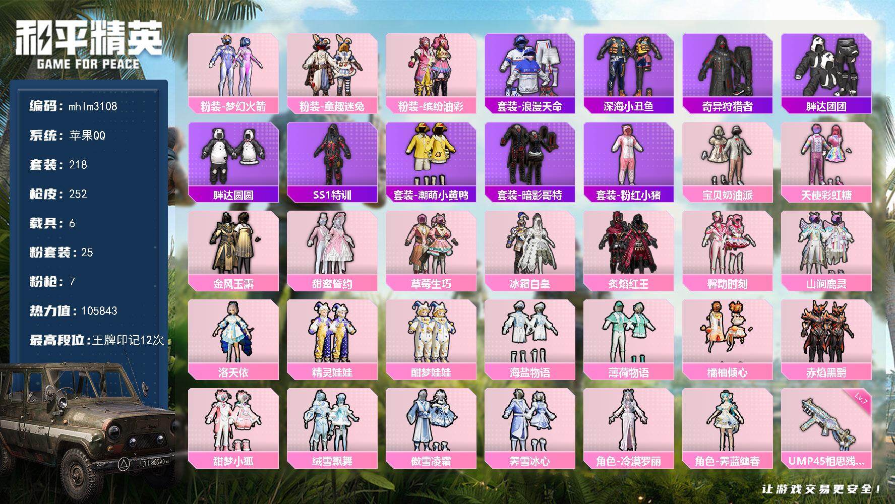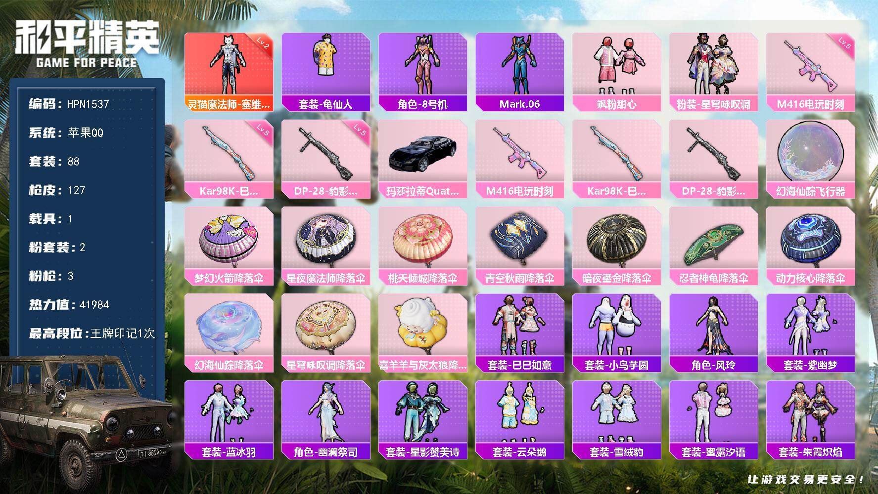 hs51606 苹果v-10王牌印记-3粉装-3特效枪-1载具-41710热力值-98套装-148