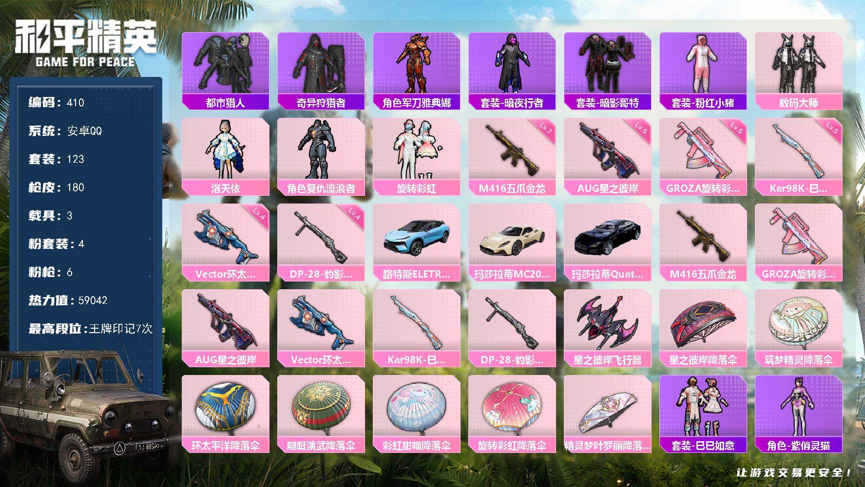 安卓 手Q-4粉装-6特效枪-3载具-1粉色飞行器-59042热力值-7王牌印