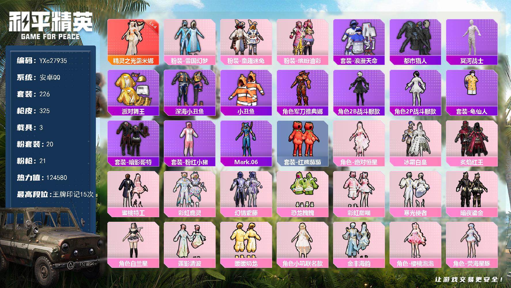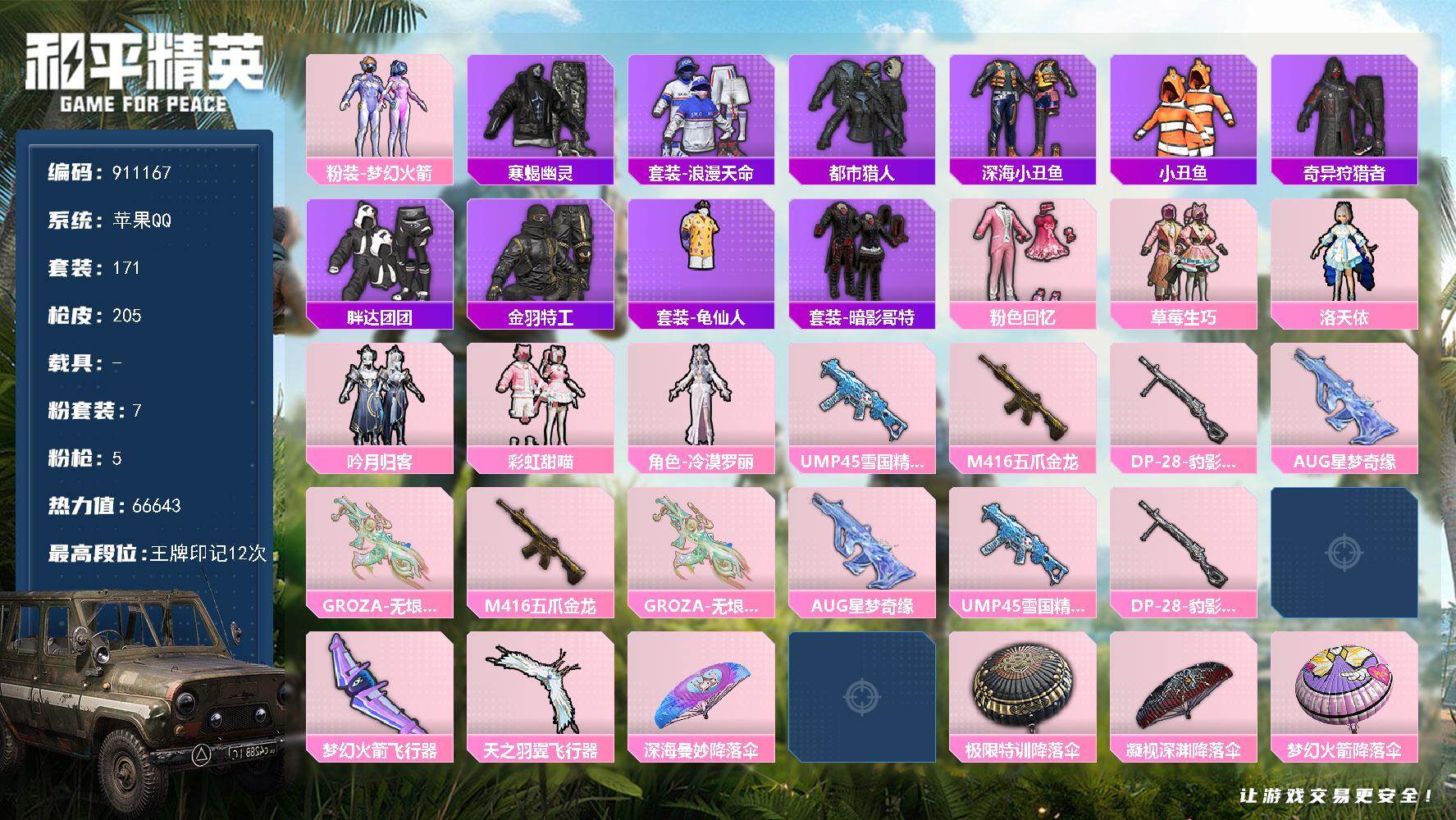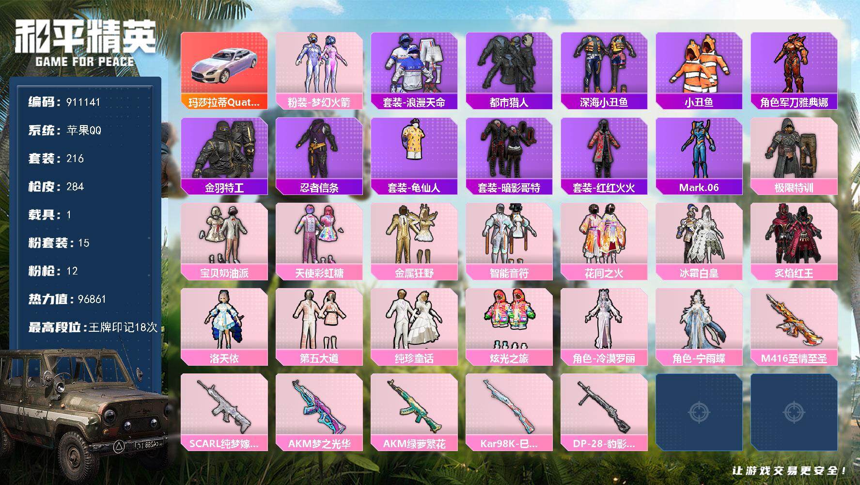 2稀有1载具15粉装12特效枪21热门216套装284枪皮 9w热力值 18印记 历史超级王牌16星