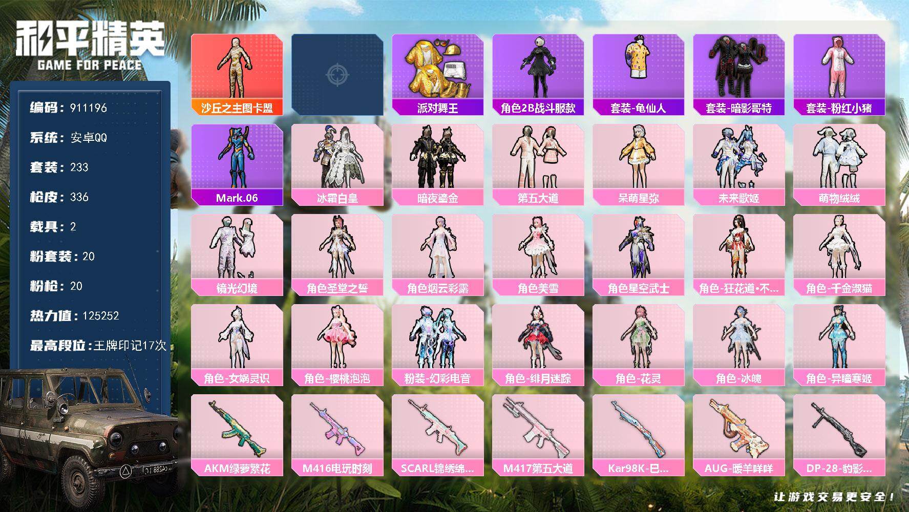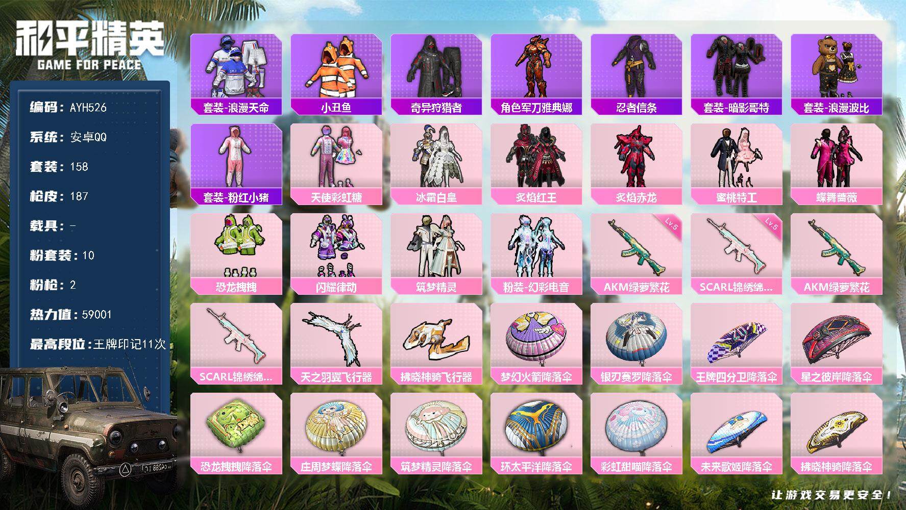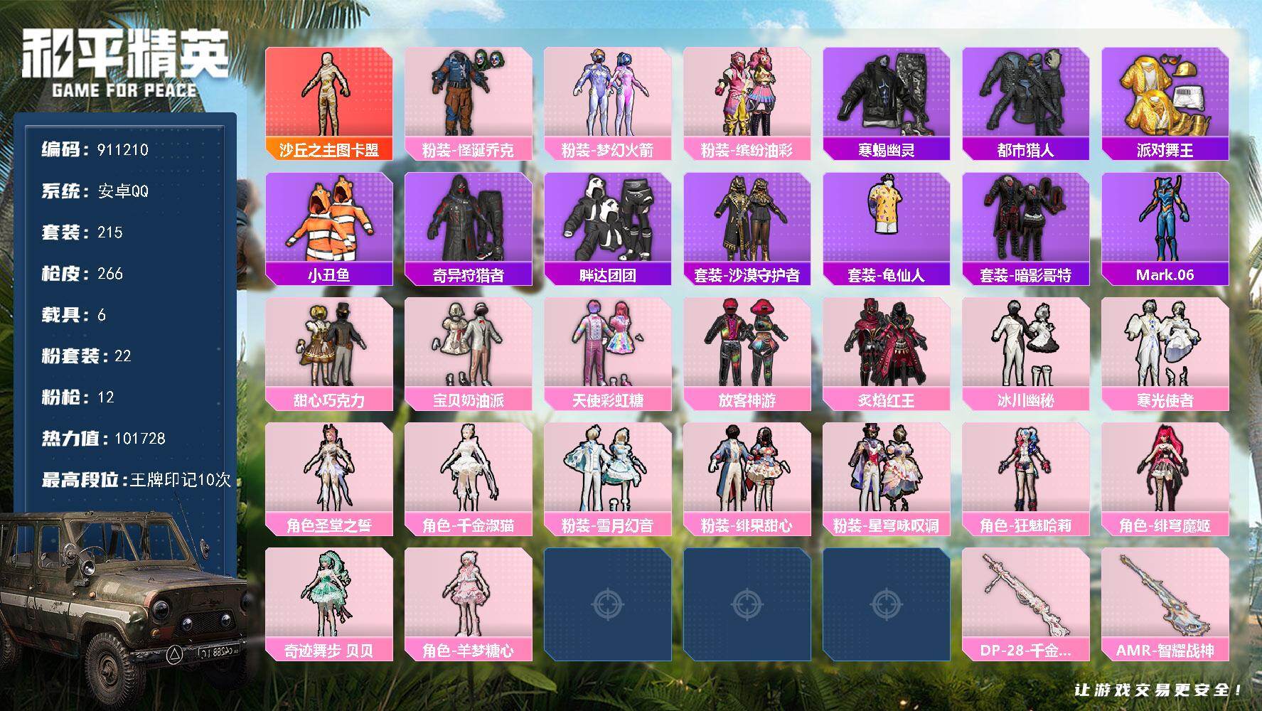 安卓 手Q-10粉装-2特效枪-0载具-2粉色飞行器-59001热力值-11王