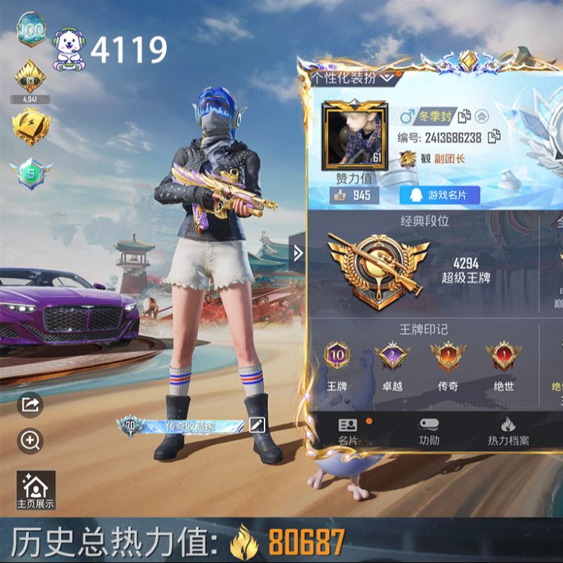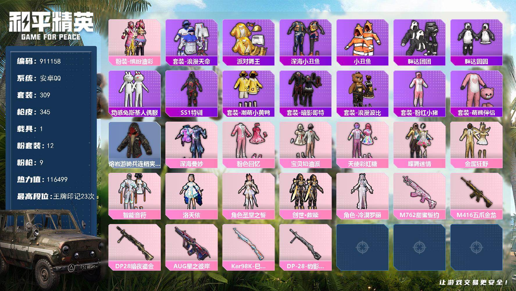 309套装/枪械9/装备407/载具1/战备267/王牌印记23/热力值116499/