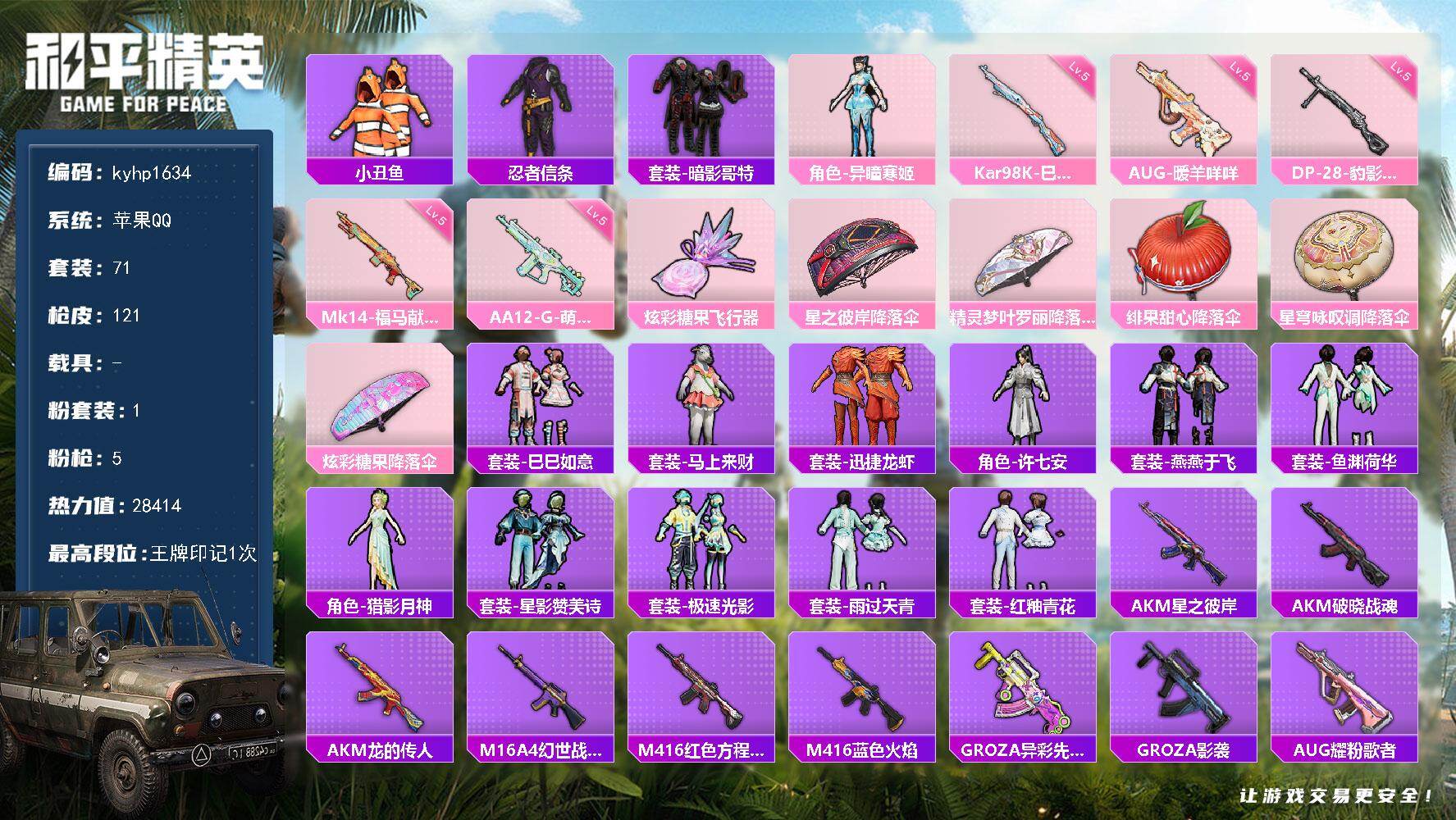 苹果 手Q-1粉装-5特效枪-0载具-1粉色飞行器-28414热力值-1王牌印