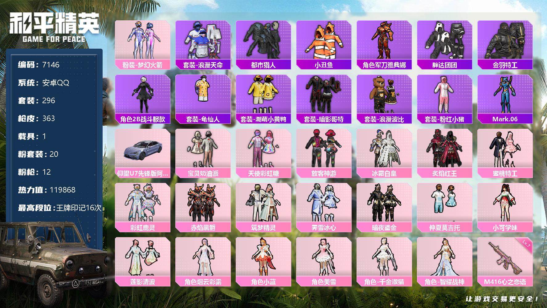 【7146】20粉装-12特效枪-1载具-119868热力值-16印记-296