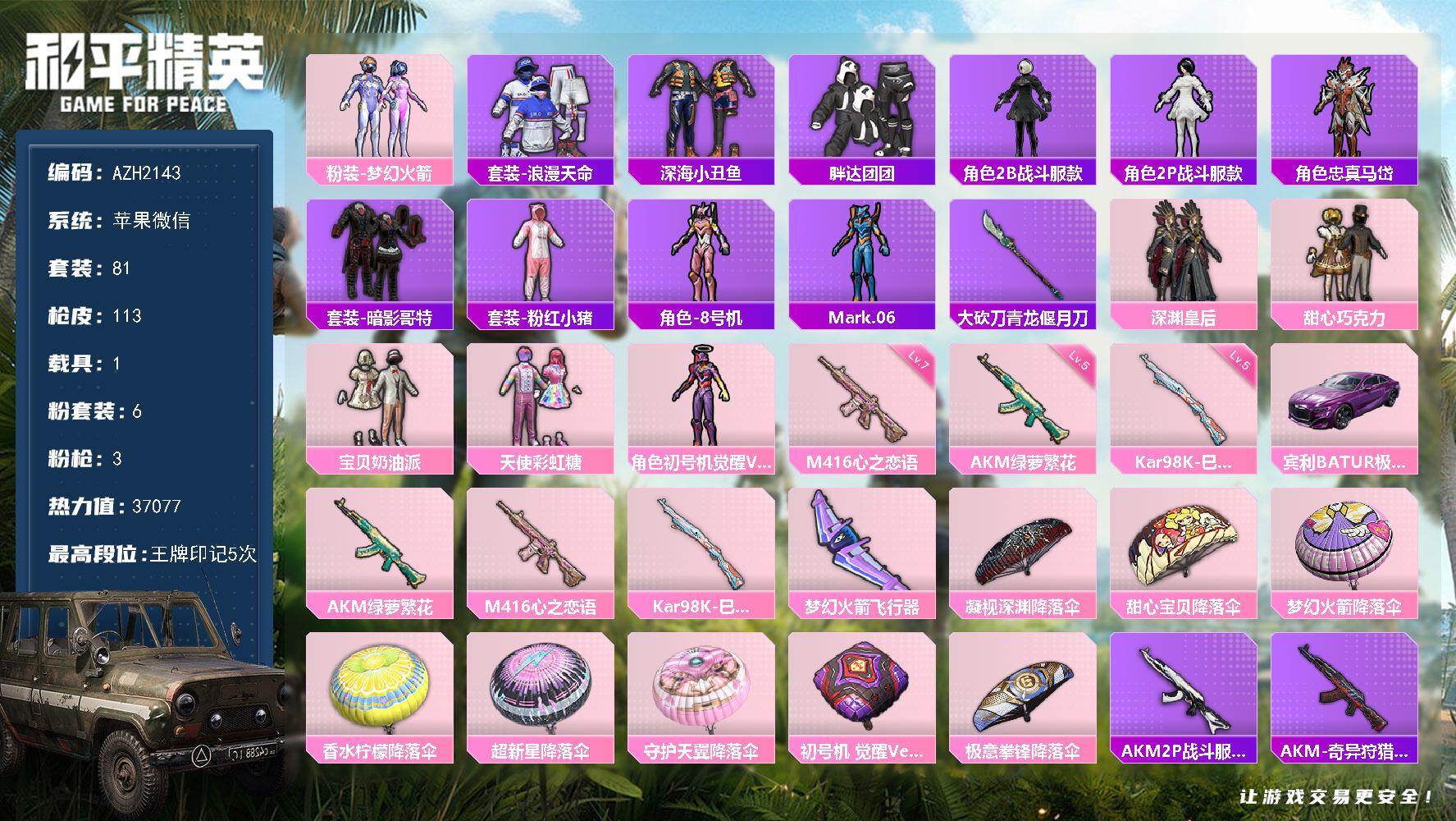苹果 手Q-4粉装-3特效枪-1载具-2粉色飞行器-31365热力值-2王牌印