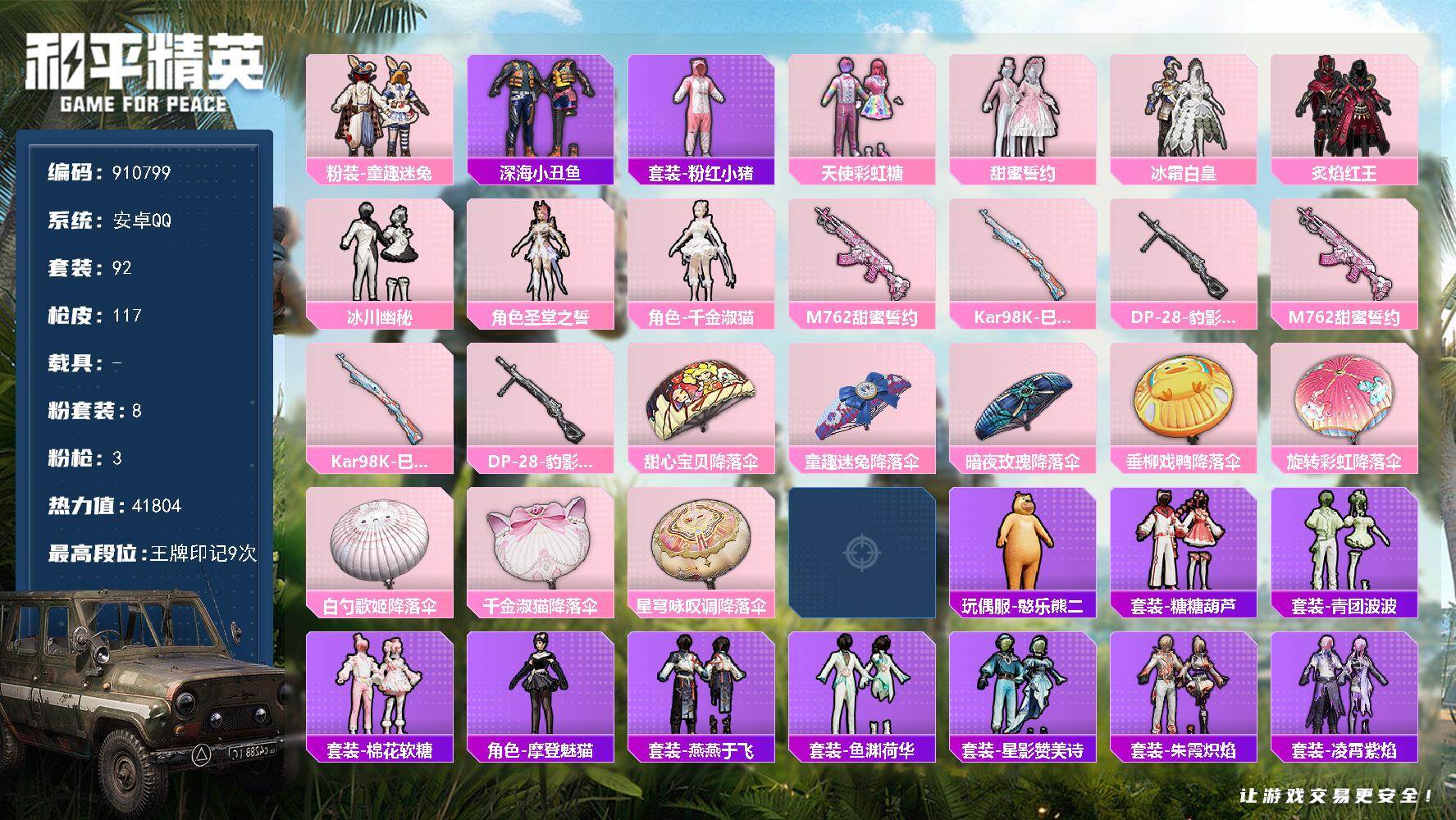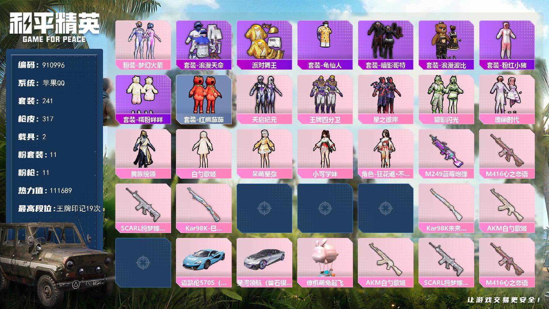 241套装/枪械11/装备394/载具2/战备232/王牌印记19/热力值111689/