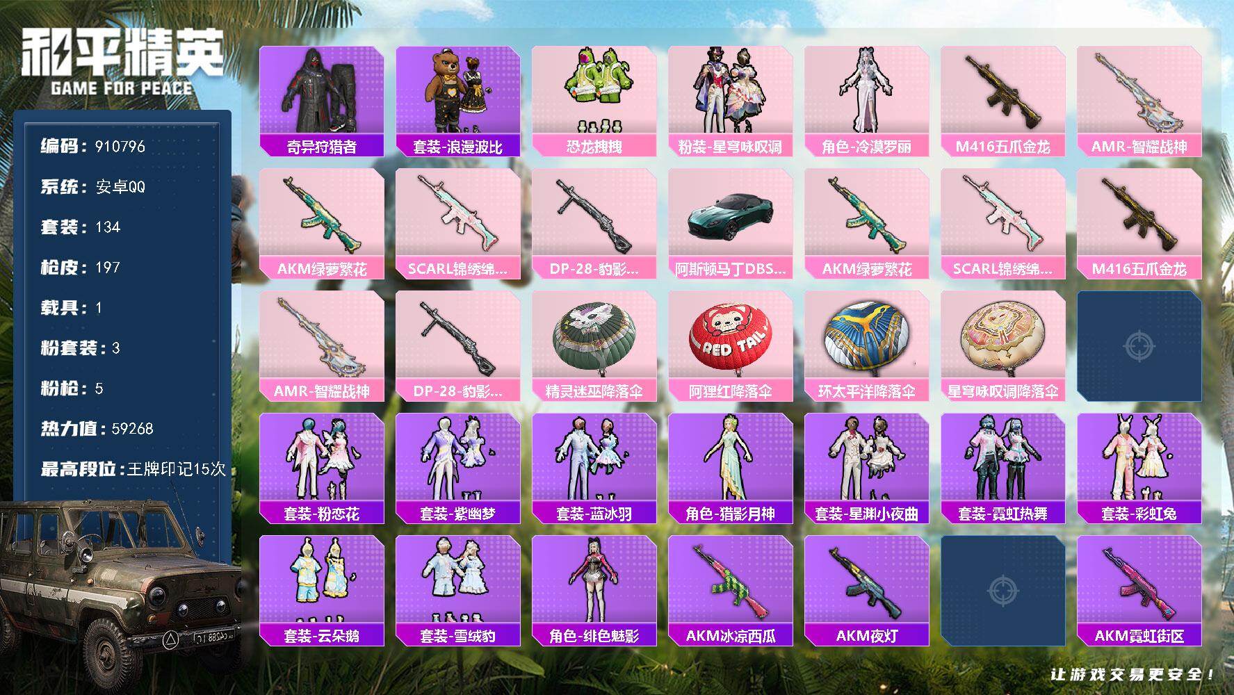 134套装/枪械5/装备192/载具1/战备139/王牌印记15/热力值59268/
