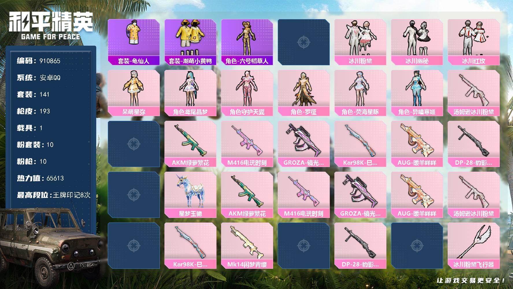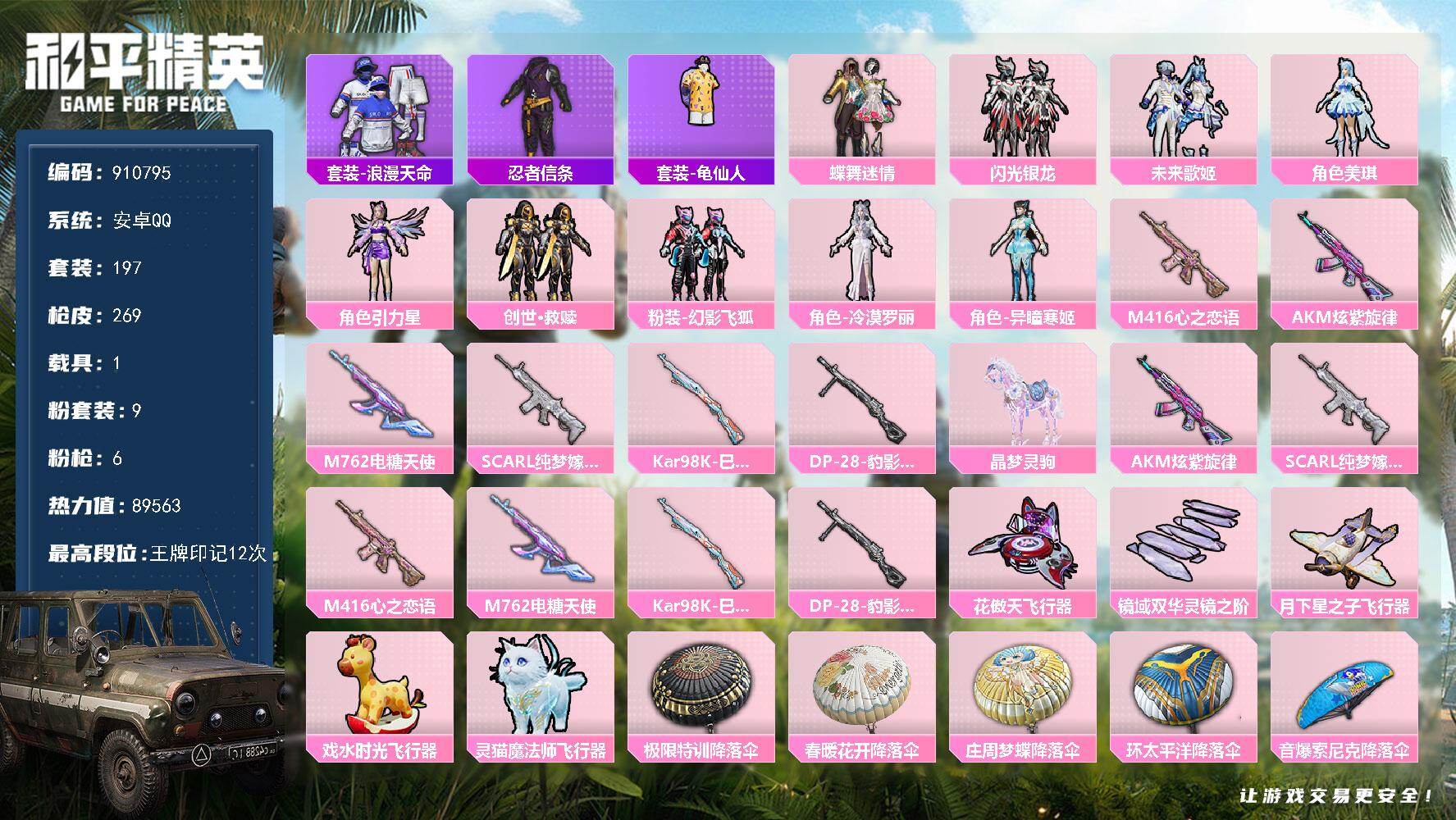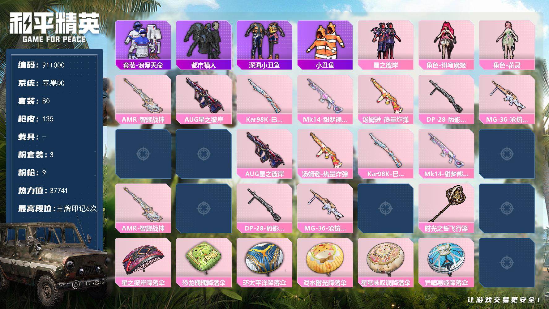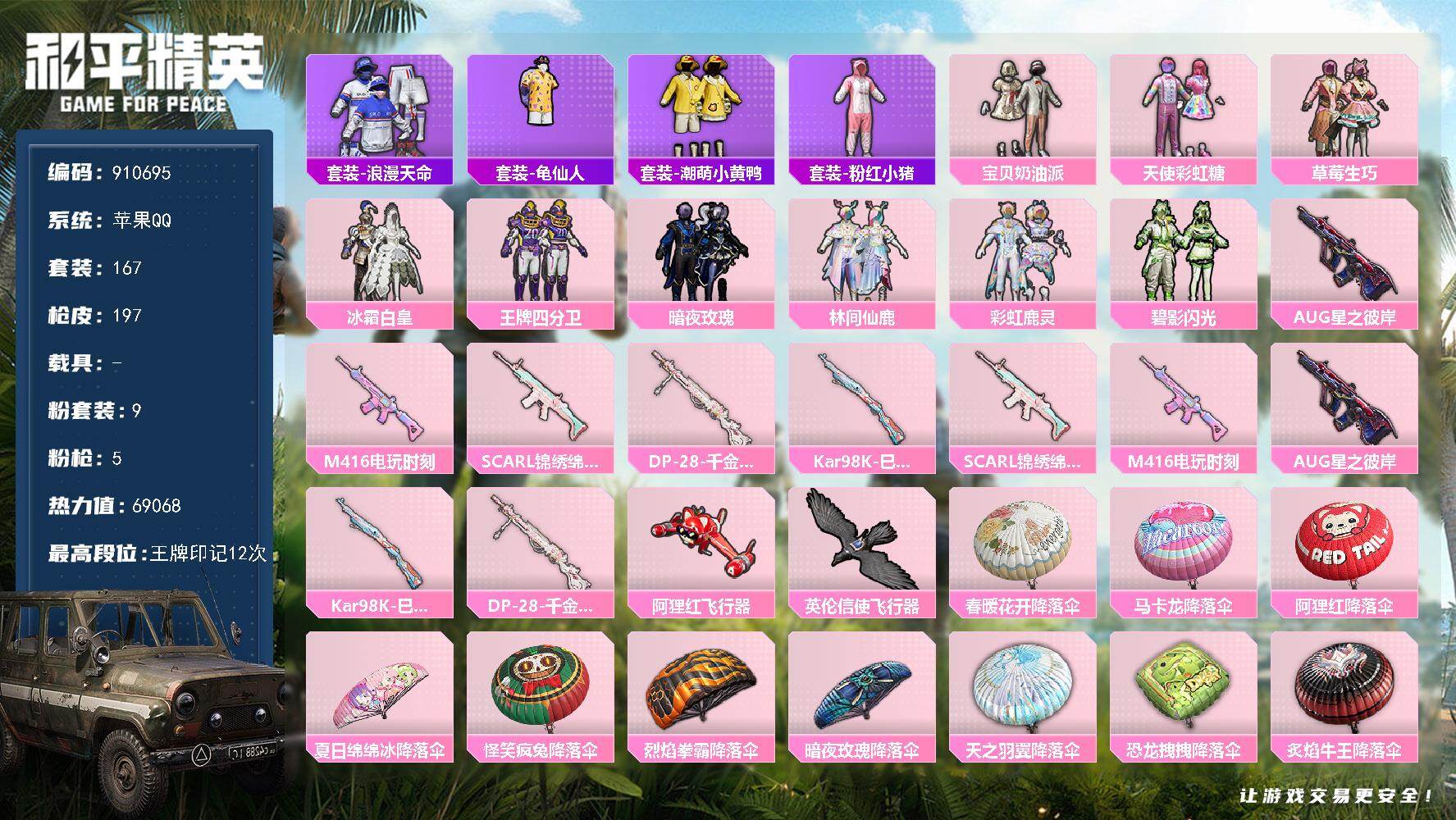 142套装/枪械6/装备255/载具1/战备167/王牌印记12/热力值60825/