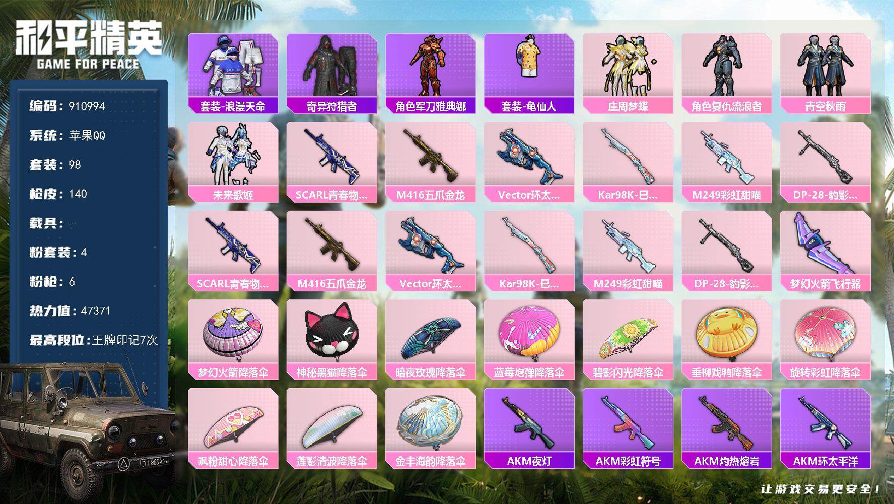 98套装/枪械6/装备178/战备107/王牌印记7/热力值47371/