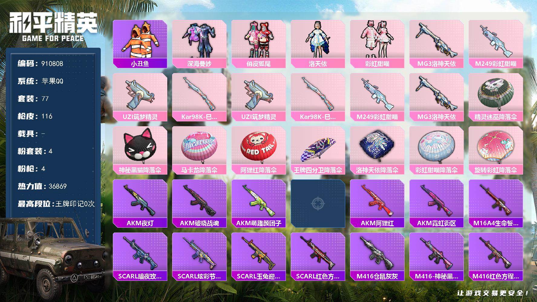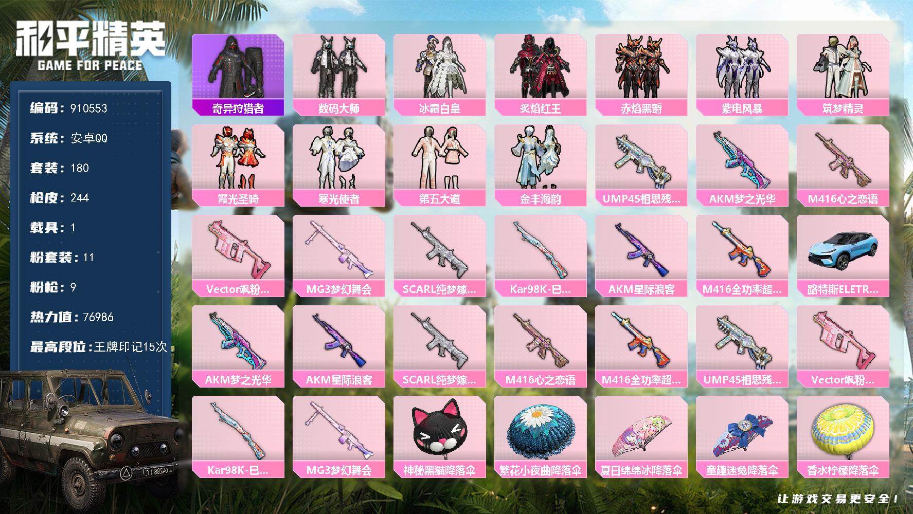 180套装/枪械9/装备296/载具1/战备160/王牌印记15/热力值76986