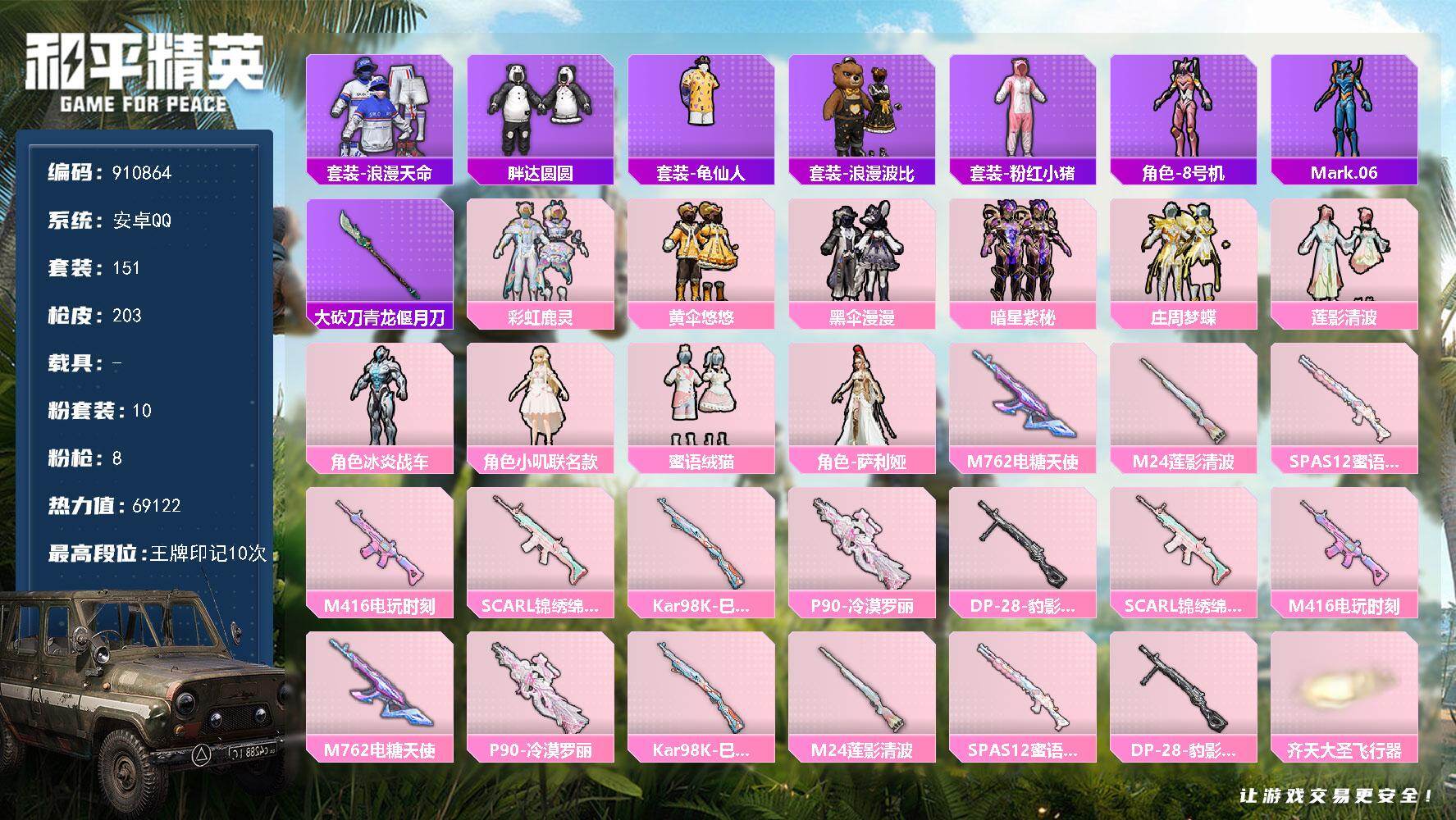141套装/枪械10/装备253/载具1/战备151/王牌印记8