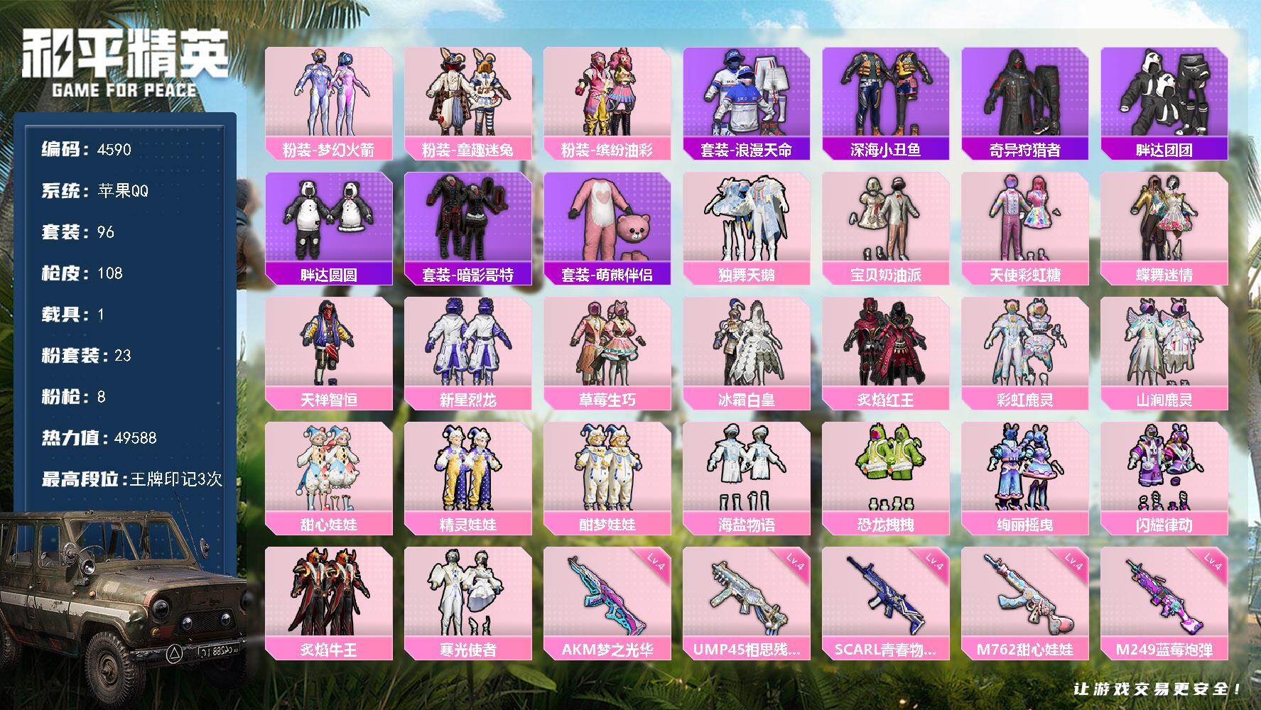 96套装/枪械8/装备168/载具1/战备108/王牌印记3/热力值49588/