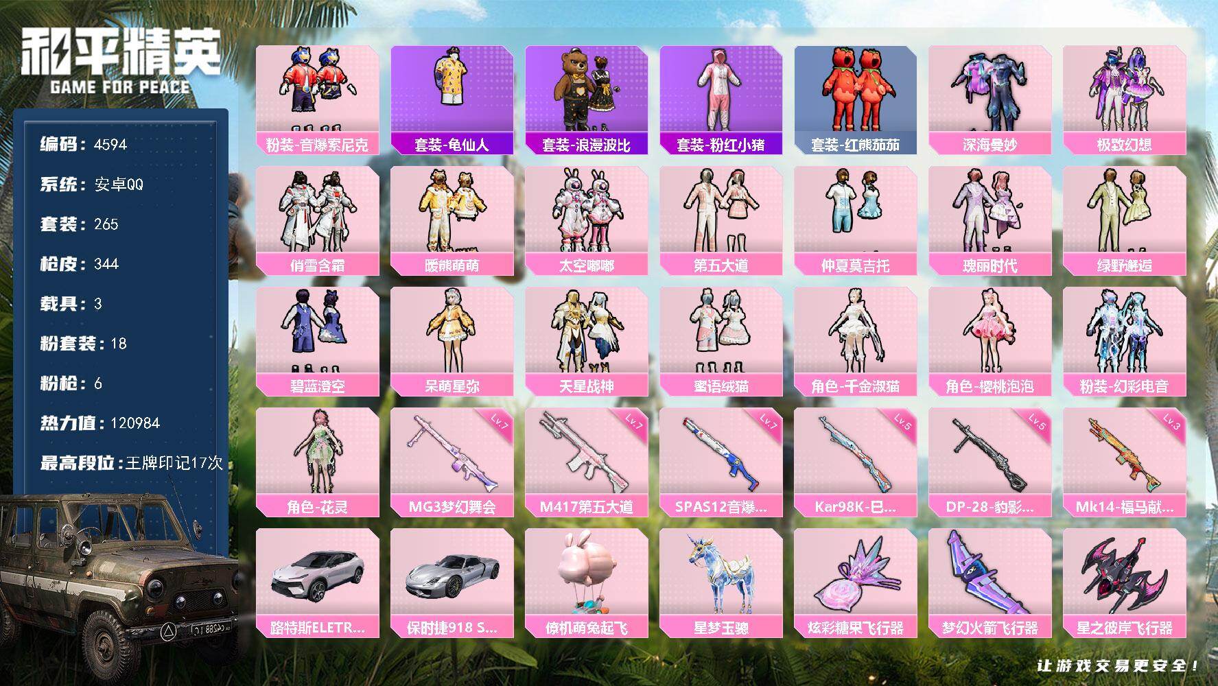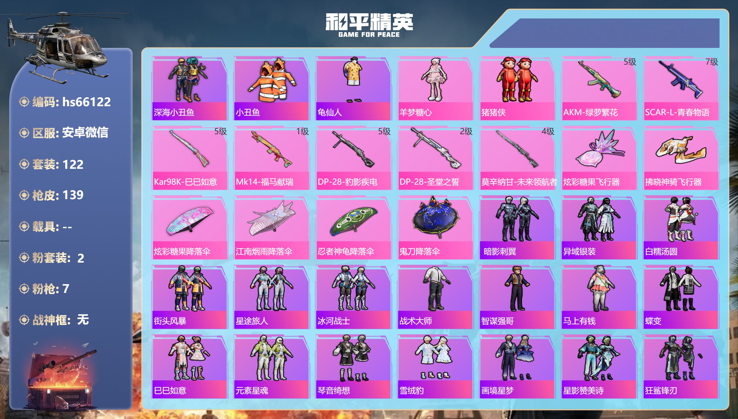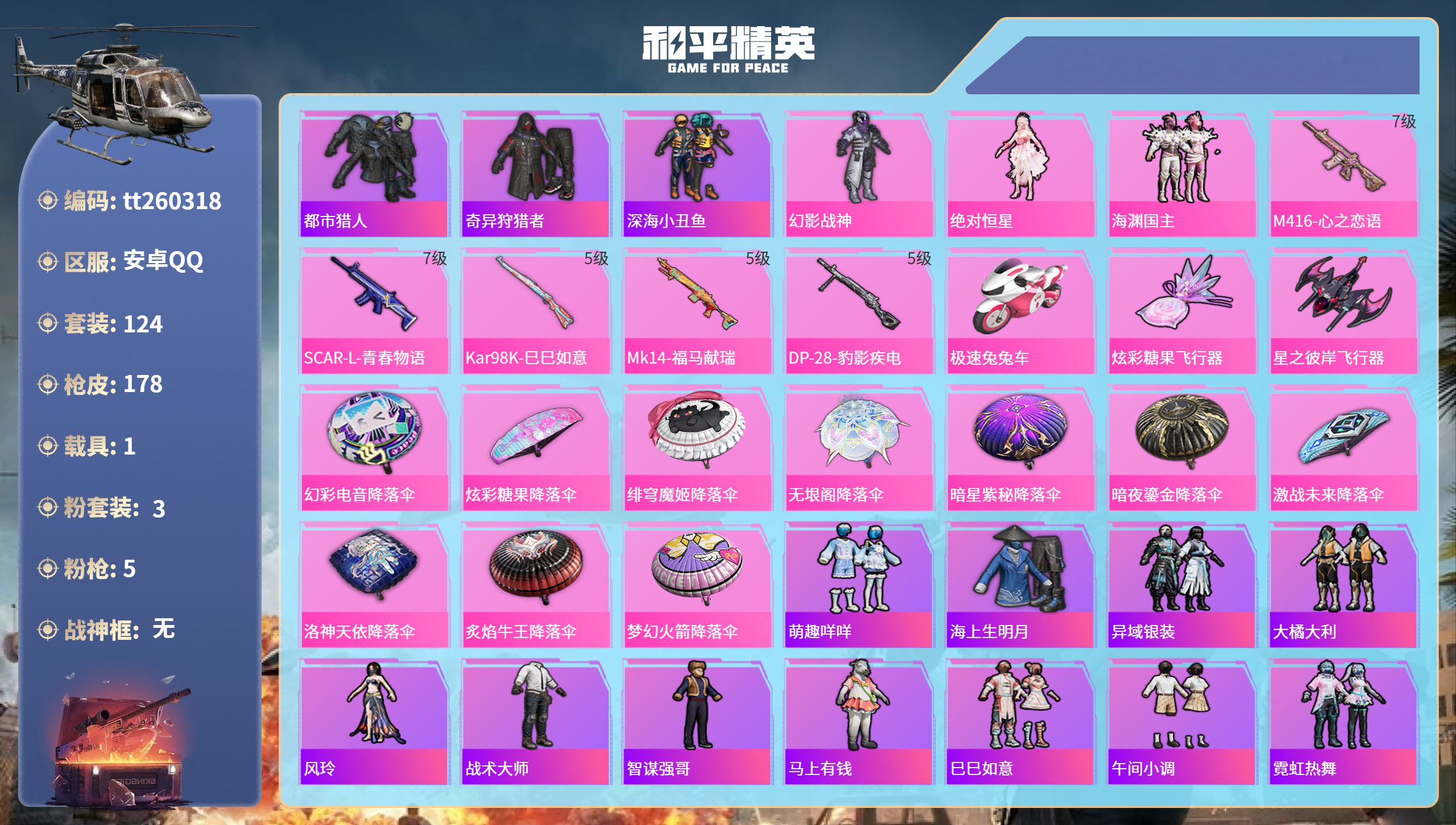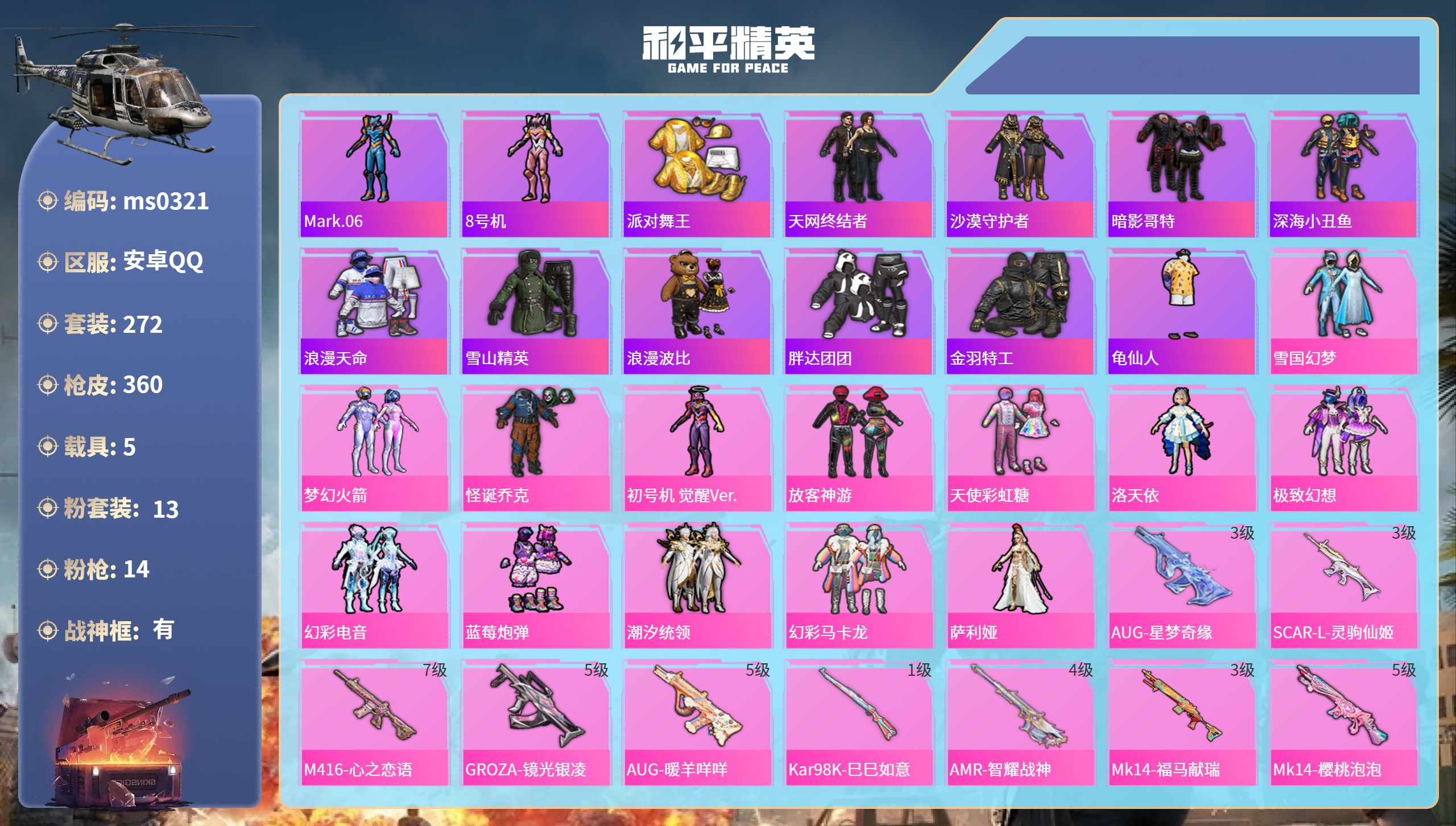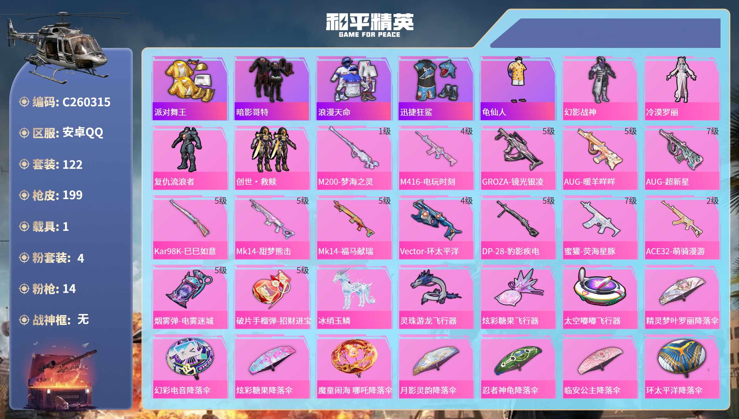 21王牌印记-有战神框-13粉装-14特效枪-5载具