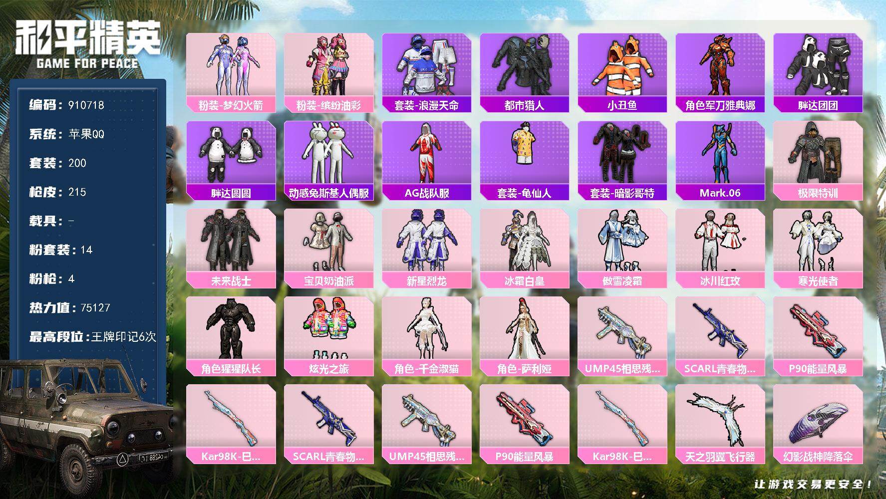 200套装/枪械4/装备300/战备187/王牌印记6/热力值75127/