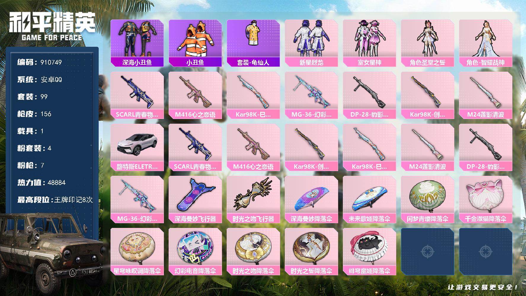 99套装/枪械7/装备189/载具1/战备123/王牌印记8/热力值48884/