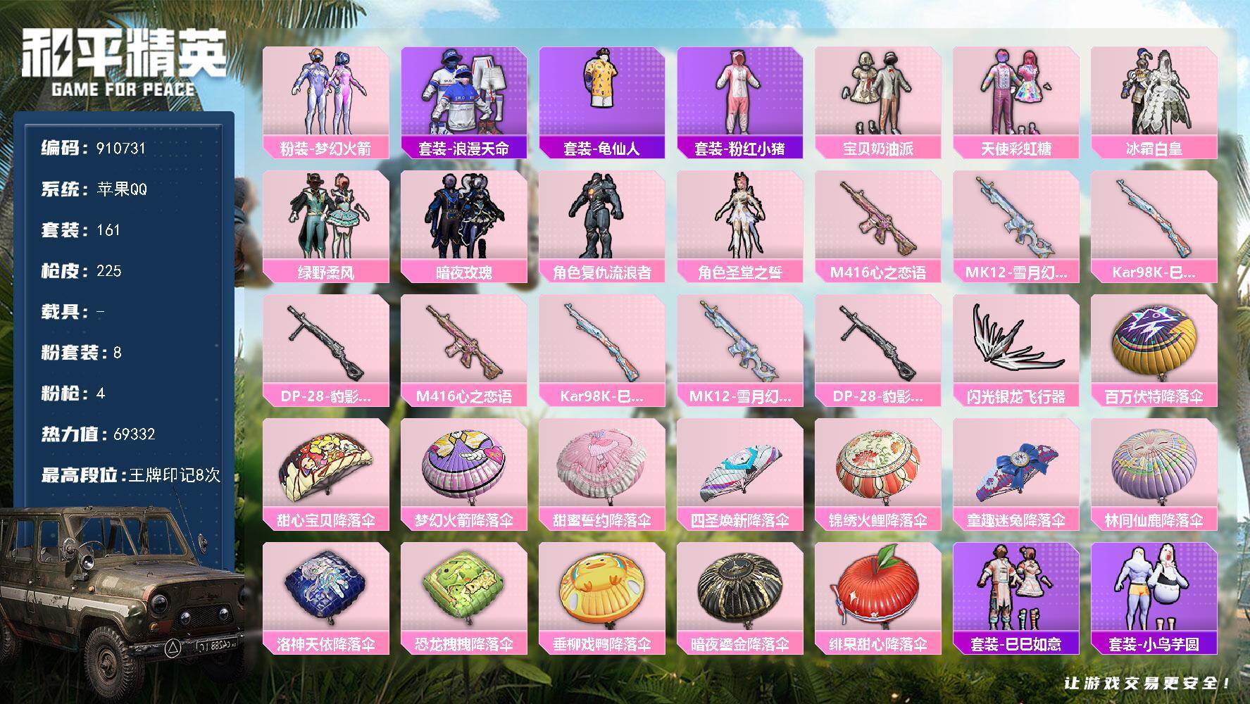 161套装/枪械4/装备275/战备160/王牌印记8/热力值69332/