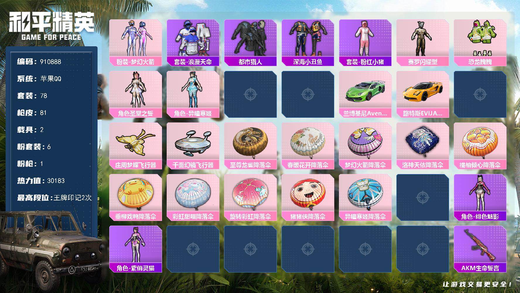 78套装/枪械1/装备120/载具2/战备67/王牌印记2/热力值30183/