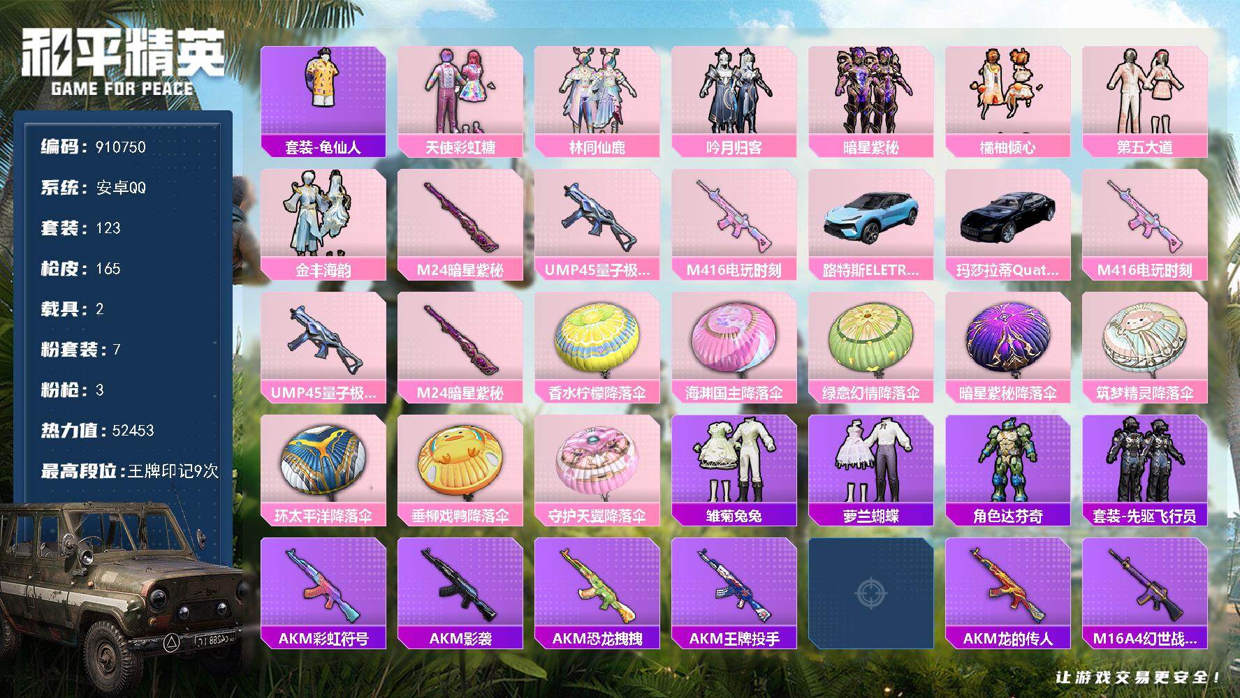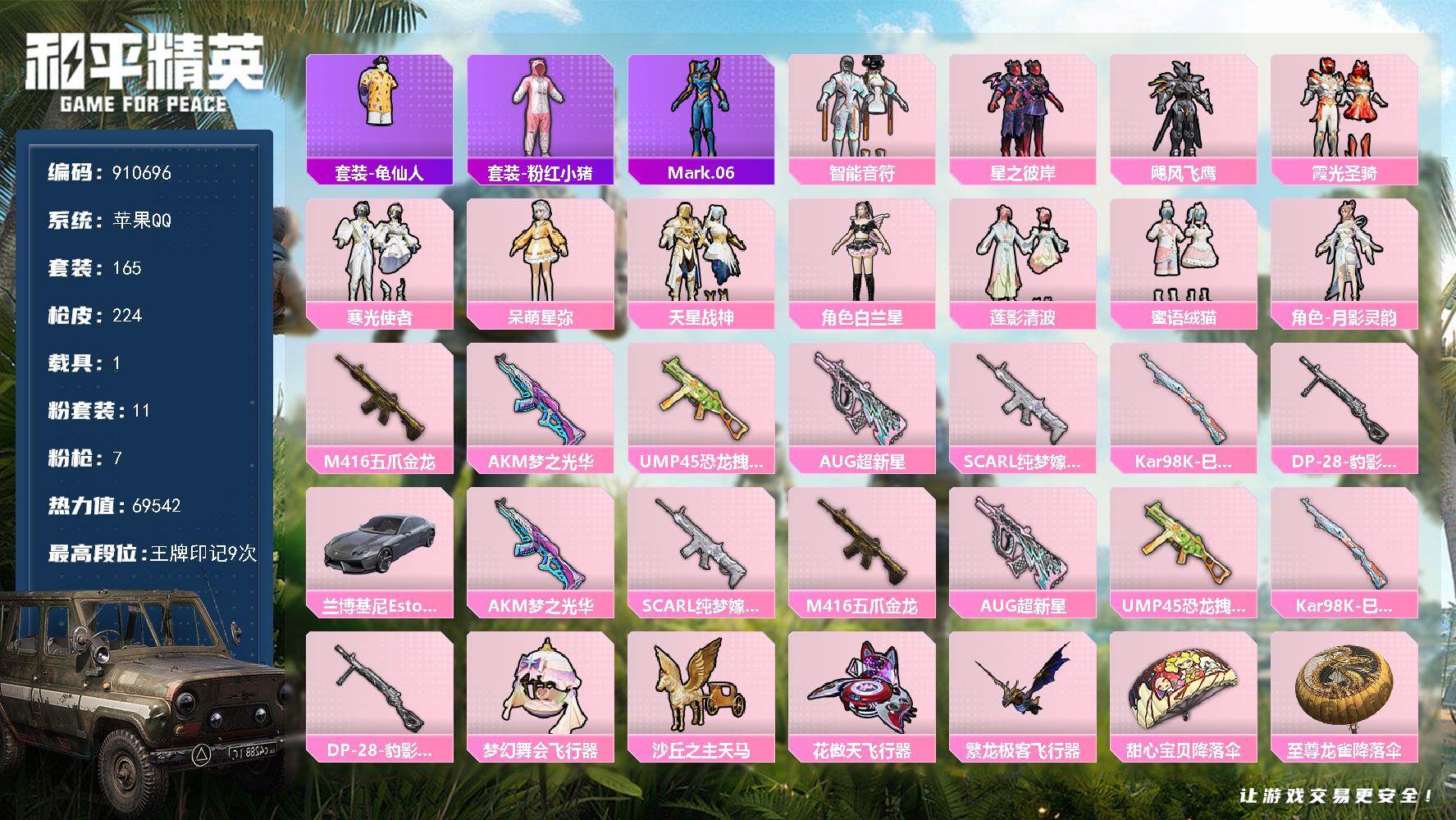 165套装/枪械7/装备272/载具1/战备148/王牌印记9/热力值69542/