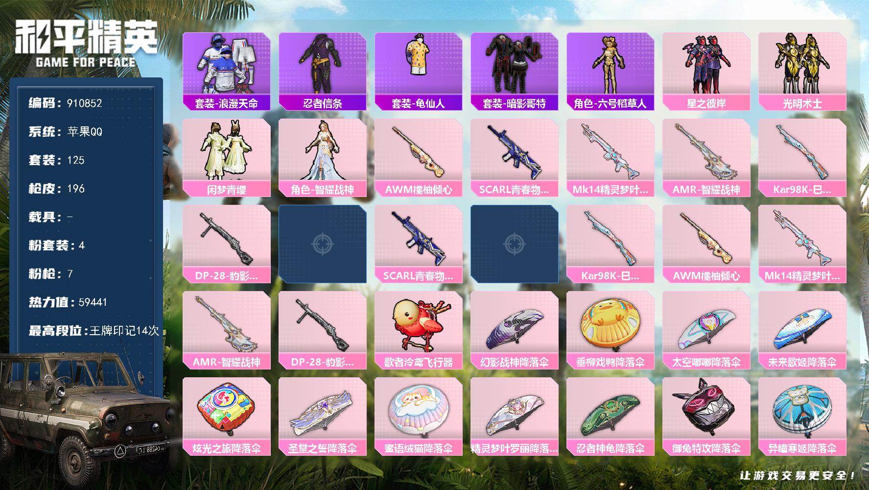 125套装/枪械7/装备225/战备136/王牌印记14/热力值59441/