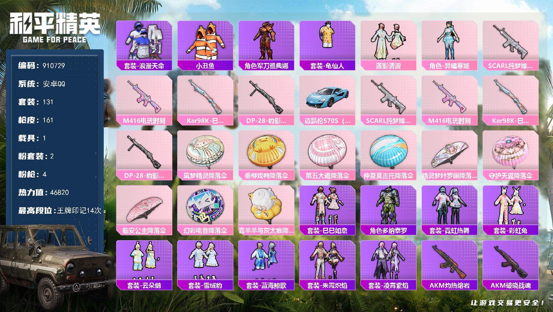 131套装/枪械4/装备177/载具1/战备112/王牌印记14/热力值46820/