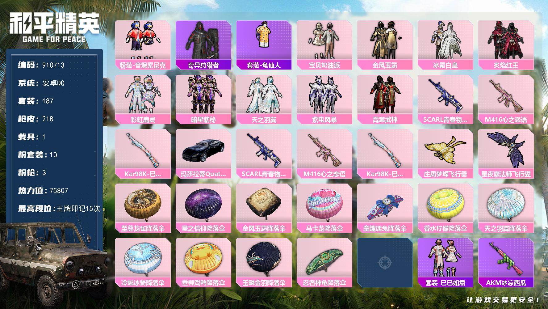 187套装/枪械3/装备307/载具1/战备150/王牌印记15/热力值75807/