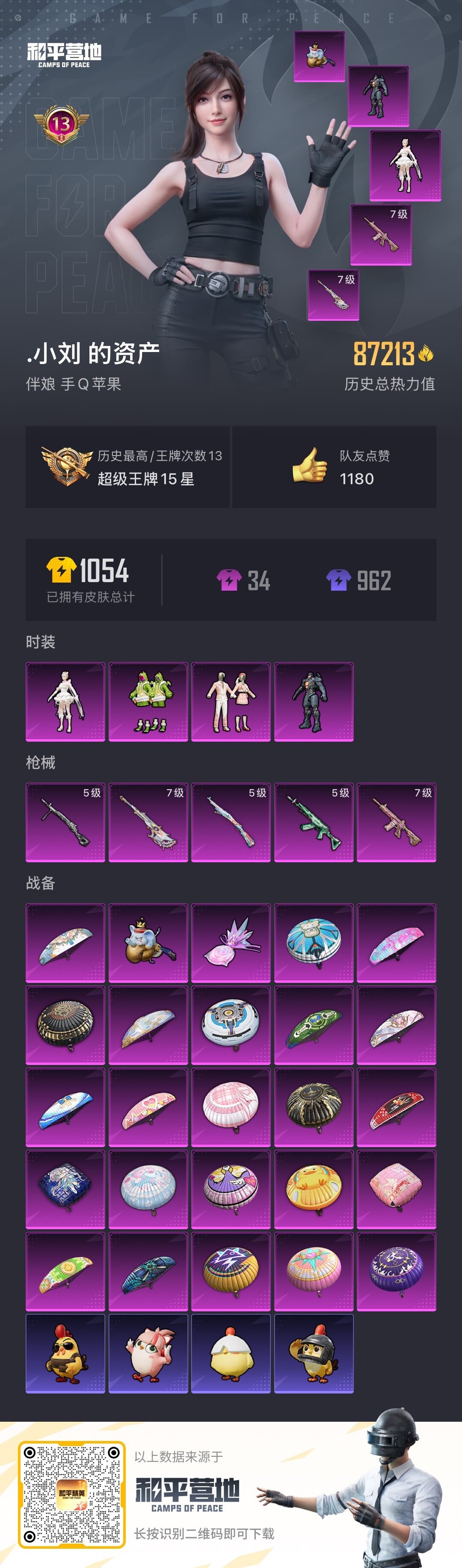 苹果 手Q-4粉装-5特效枪-0载具-2粉色飞行器-87213热力值-13王牌