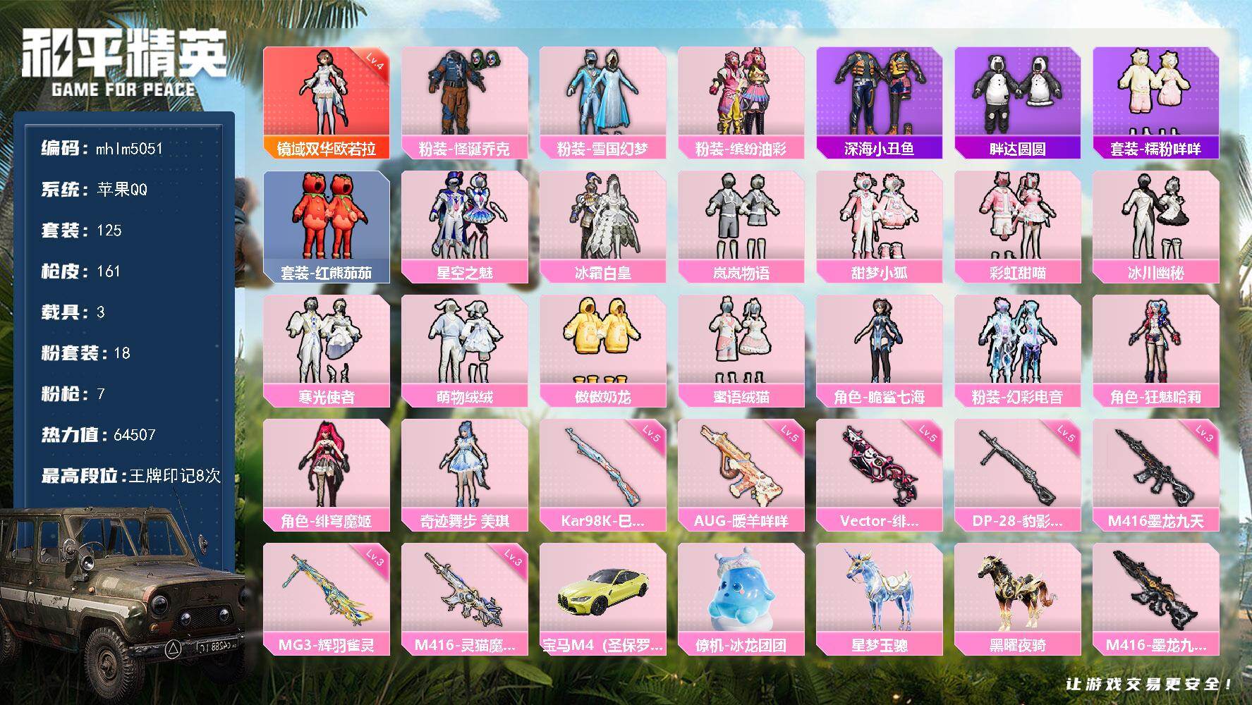 苹果 手Q-1神装-18粉装-7特效枪-3载具-13粉色飞行器-64507热力值