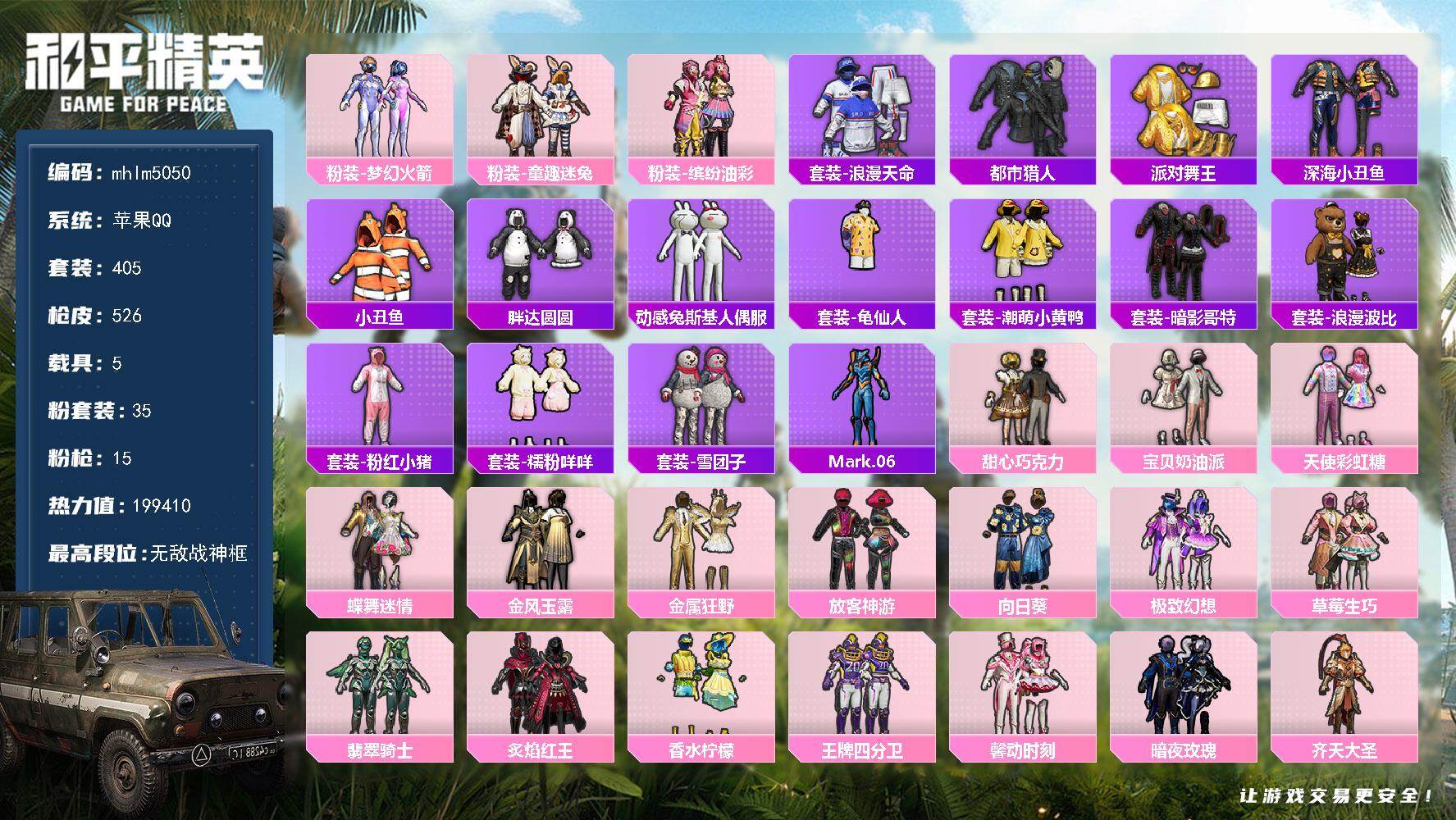 苹果 手Q-无敌战神框-35粉装-15特效枪-5载具-14粉色飞行器-19941