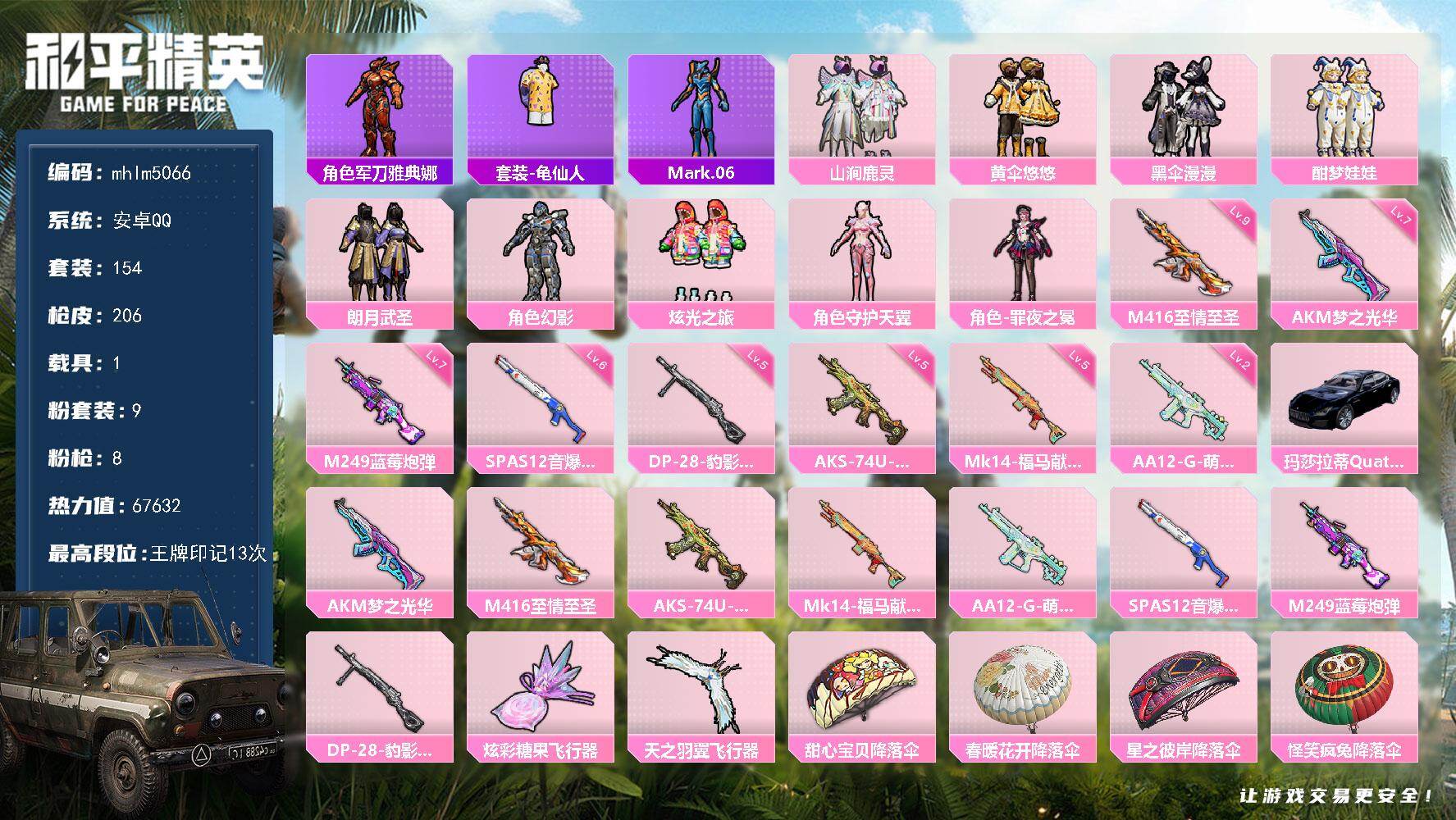 安卓 手Q-9粉装-8特效枪-1载具-2粉色飞行器-67632热力值-13王牌印