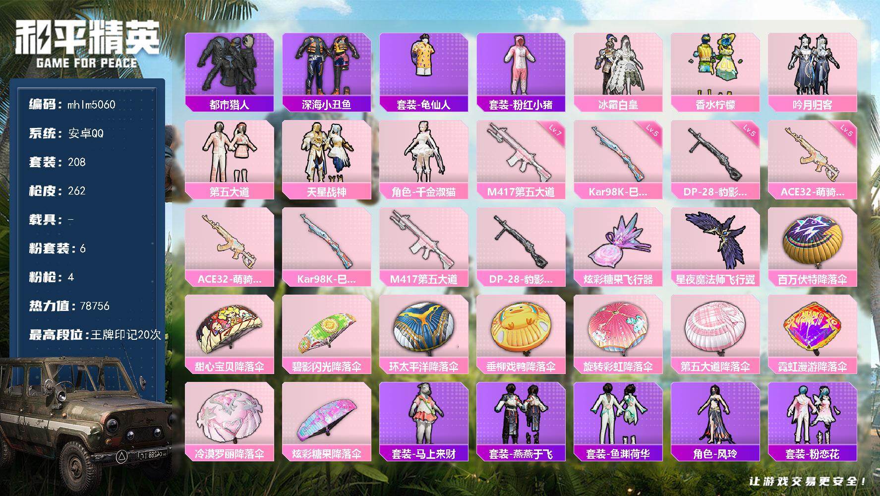 安卓 手Q-6粉装-4特效枪-0载具-2粉色飞行器-78756热力值-20王牌印