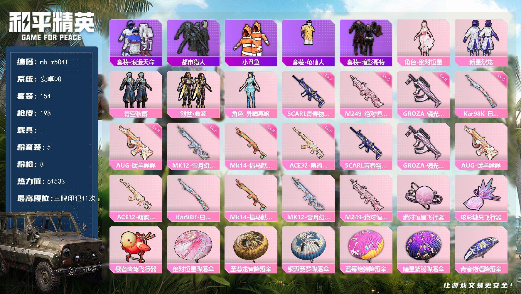 安卓 手Q-5粉装-8特效枪-0载具-3粉色飞行器-61533热力值-11王牌印